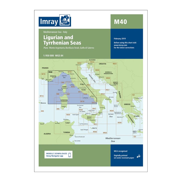 Printed on water-resistant paper and produced according to MCA-approved standards, with the option of digital updates via the Imray Navigator app.