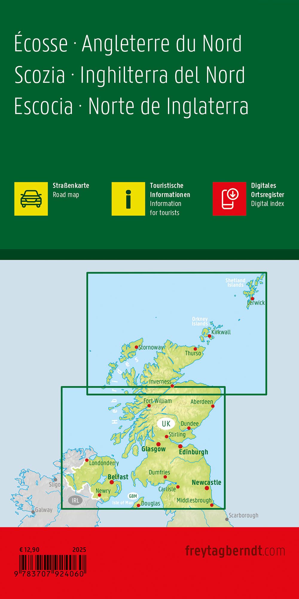 Covering Scotland and the North of England, this road map provides a detailed and clear representation of the region’s road network and landscape. The map is well suited to both planning and undertaking journeys, and provides a solid basis for exploring the area by car.