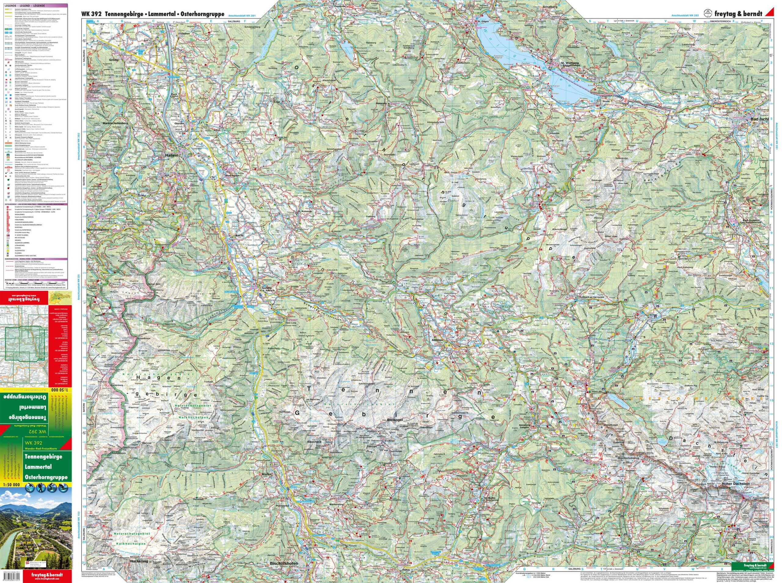 This detailed map covers the Tennengebirge, Lammertal and Osterhorngruppe in the border area between Austria and Germany, providing a good overview of a varied alpine landscape with mountains, valleys and lakes. The map is suitable for both planning and navigation, whether you’re exploring the area by car or combining your trip with outdoor activities.