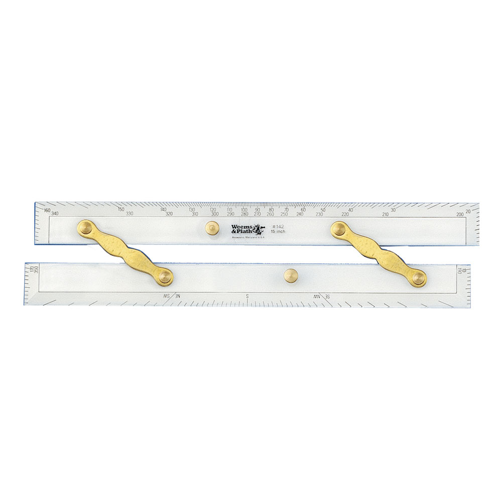 The Weems & Plath Parallel Ruler 15″ (38.1 cm) in brass is a premium navigation ruler designed for accurate course plotting and alignment on nautical charts. This model is made with sturdy brass frames and clear acrylic blades with a degree scale, making it easy to transfer courses and angles parallel across the chart.