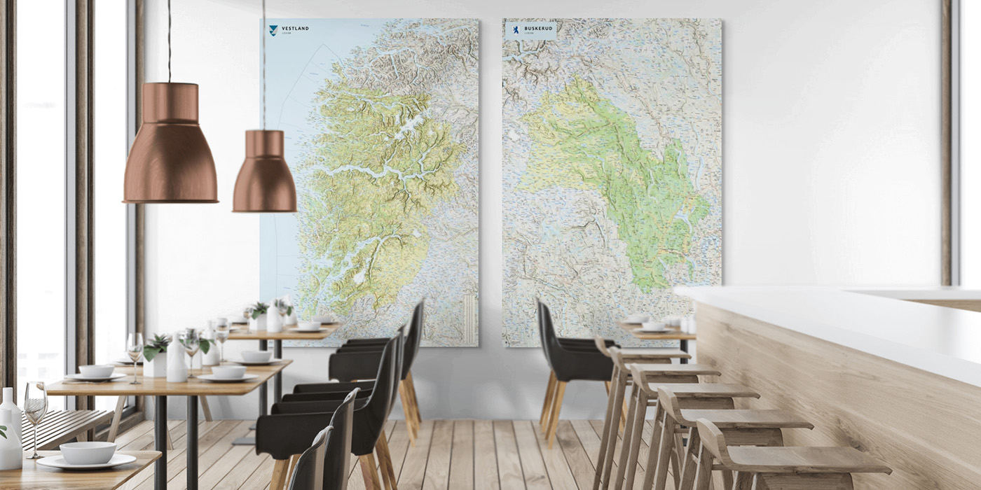 Fylkeskart over Vestland og Buskerud – montert på plate som veggdekor i et lyst cafémiljø. Kartene er del av vår komplette serie over alle norske fylker.