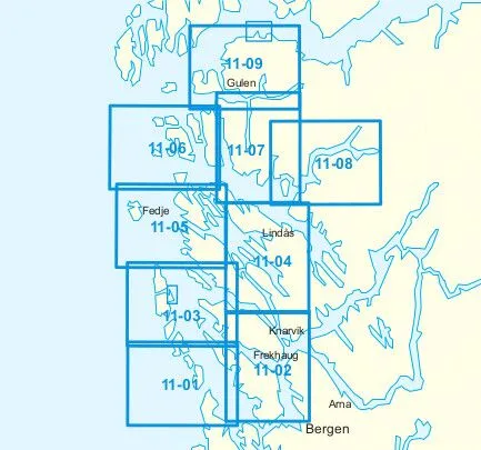 Kartet dekker fra Bergen i sør til Gulen (innløpet til Sognefjorden) i nord. Kartmappen består av 10 kartblad.