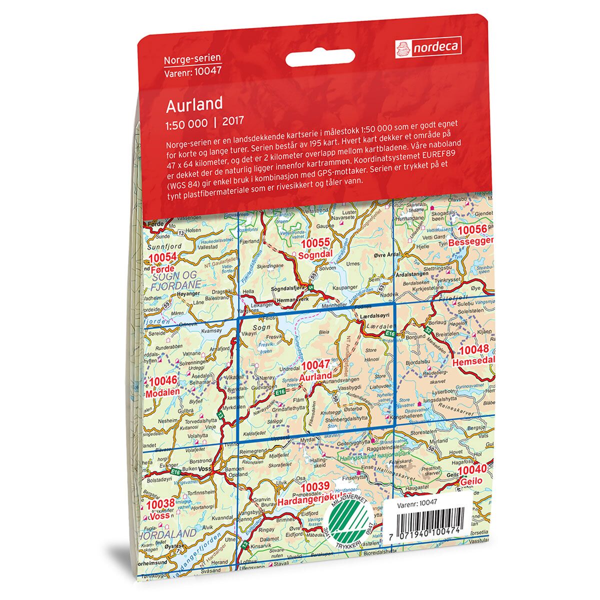 Dette kartet dekker området Aurland og er en del av Norge-serien – de ikoniske røde turkartene som i flere generasjoner har vært brukt av turfolk over hele landet. Norge-serien er den eneste turkartserien som dekker hele Norge, fra Lindesnes til Nordkapp.