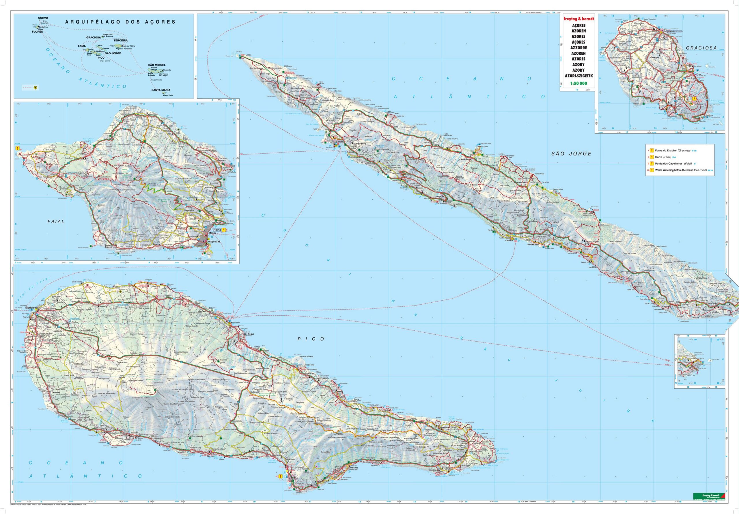 Dette er et omfattende og presist veikart over Azorene, tilpasset reisende som ønsker maksimal detaljgrad ved ferdsel med bil, motorsykkel eller campingvogn. Kartet dekker øygruppen i målestokk 1:50 000 og gir en svært nøyaktig fremstilling av veinett, terreng og bosetning, noe som gjør det ideelt for både orientering og ruteplanlegging.