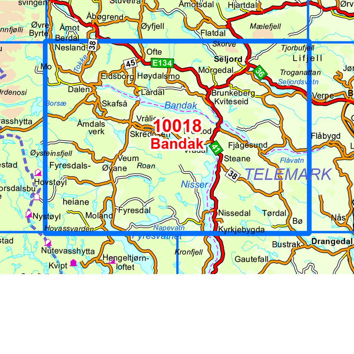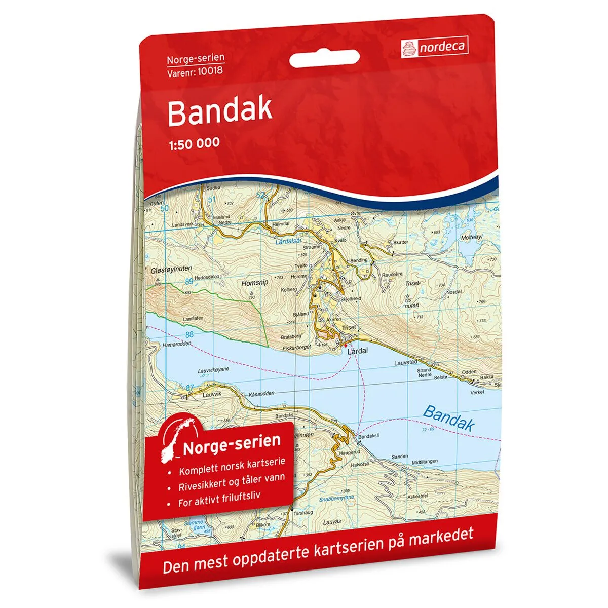 Dette kartet dekker området Bandak og er en del av Norge-serien – de ikoniske røde turkartene som i flere generasjoner har vært brukt av turfolk over hele landet. Norge-serien er den eneste turkartserien som dekker hele Norge, fra Lindesnes til Nordkapp.