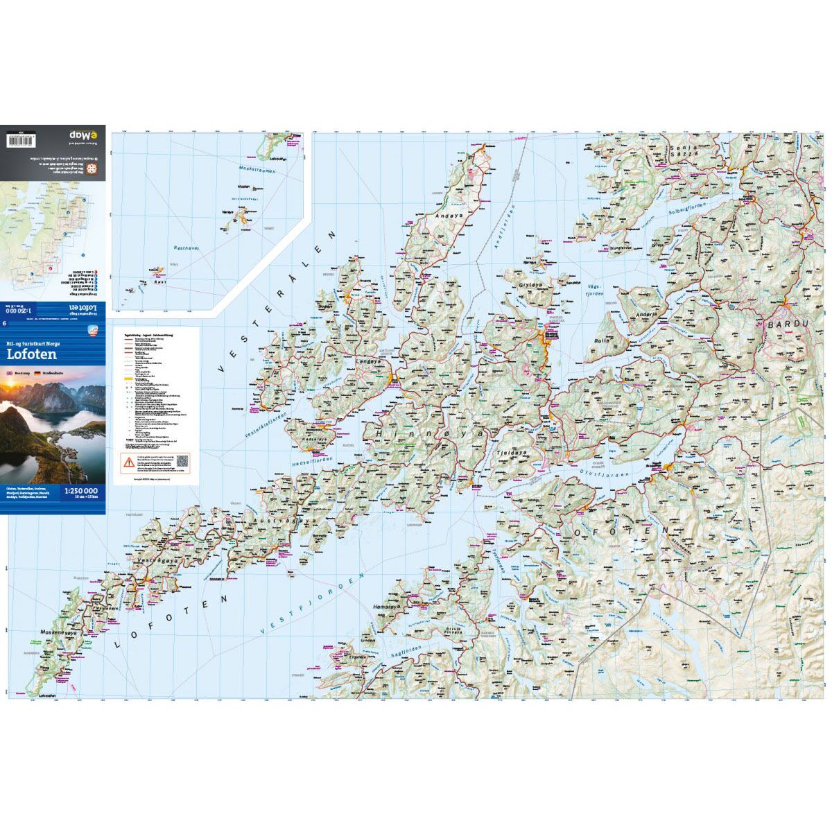 Dette bil- og turistkartet dekker Lofoten, Vesterålen, Narvik og Ofoten og gir en god oversikt over veinettet i Nord-Norge. Kartet er utviklet for bilturer og oppdagelsesferder, og gjør det enkelt å planlegge ruter gjennom noen av landets mest spektakulære landskap.