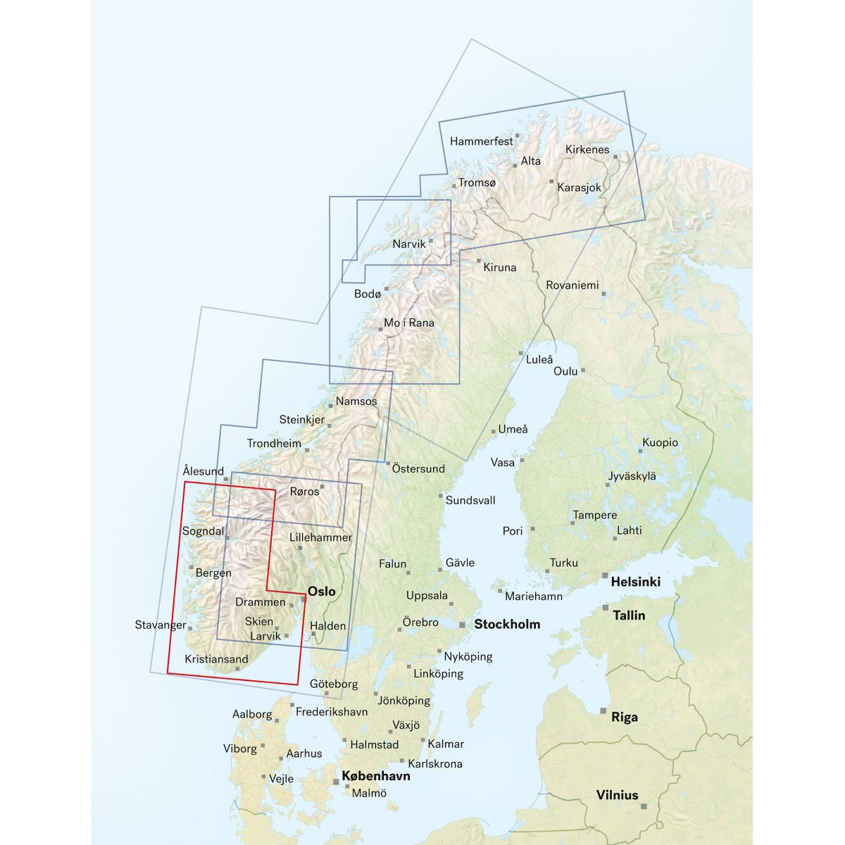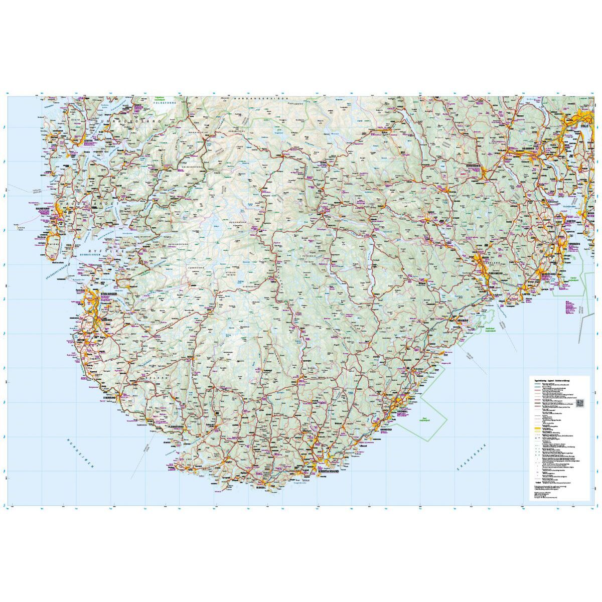 Dette bil- og turistkartet dekker Sør- og Vestlandet og gir en samlet oversikt fra Oslo til Stavanger, samt Vestlandet rundt Bergen. Kartet omfatter blant annet Lysefjorden, Hardangervidda og Sognefjorden, og gir god oversikt over regionens veinett og reisemuligheter.