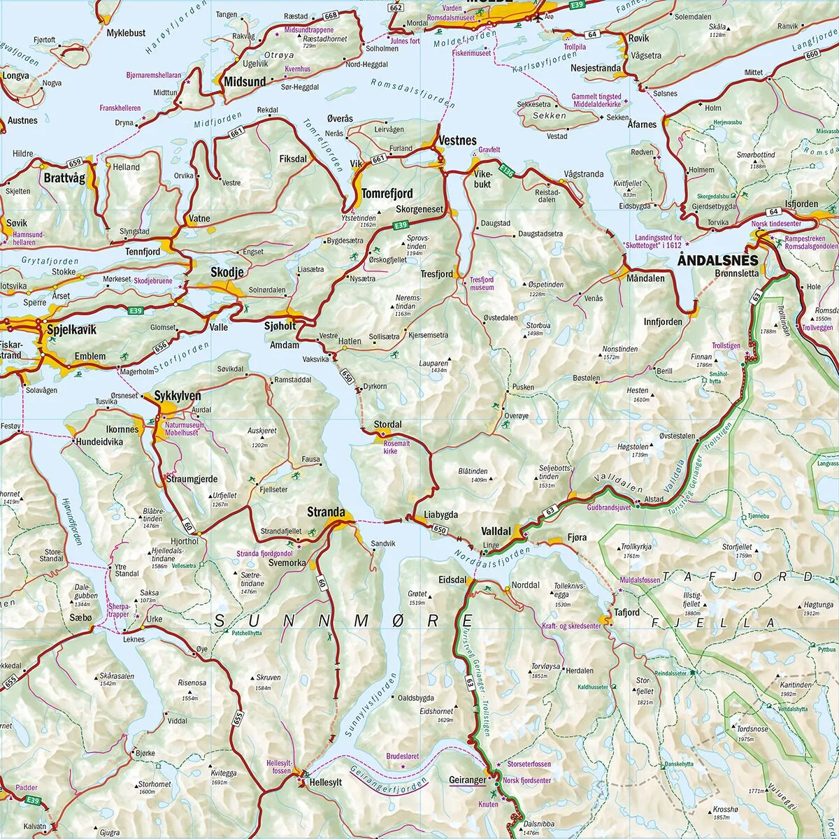 Veier, fergeforbindelser og tettsteder er tydelig markert, og kartet fremhever nasjonale turistveier samt sentrale natur- og kulturattraksjoner. Det gjør det enkelt å planlegge ruter mellom kyst, fjord og fjell – enten du reiser med bil, bobil eller motorsykkel.