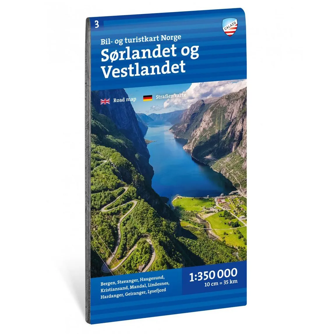 Oppdatert bil- og turistkart over Sør- og Vestlandet i målestokk 1:350 000. Kartet gir god oversikt over veinett, turistveier og reisemål i regionen.
