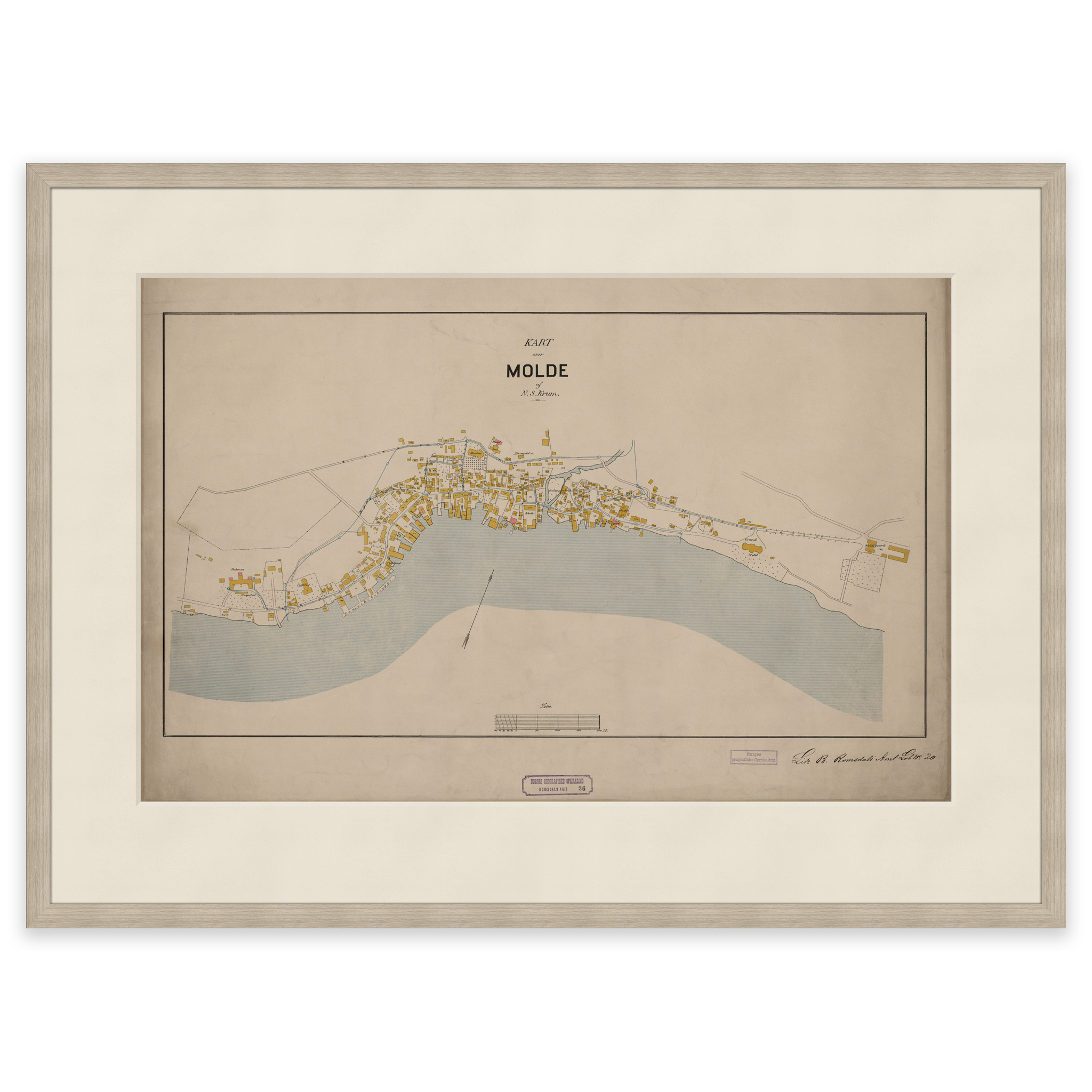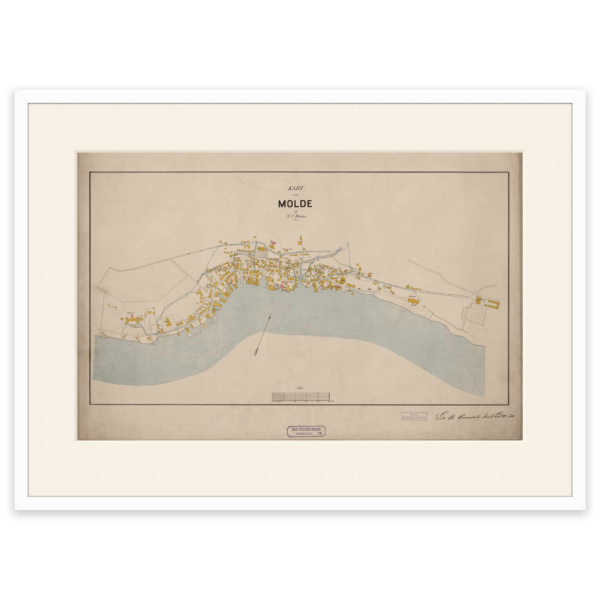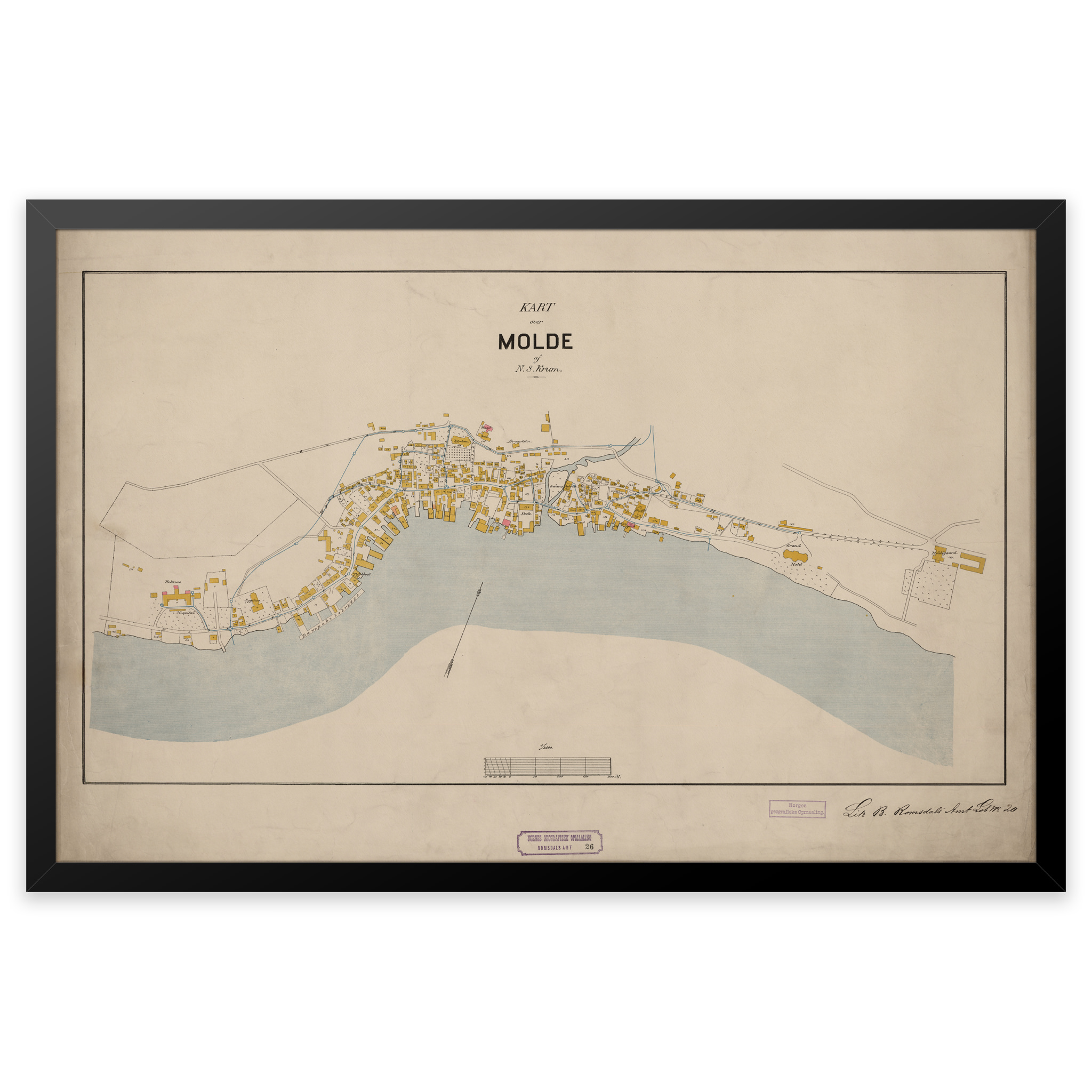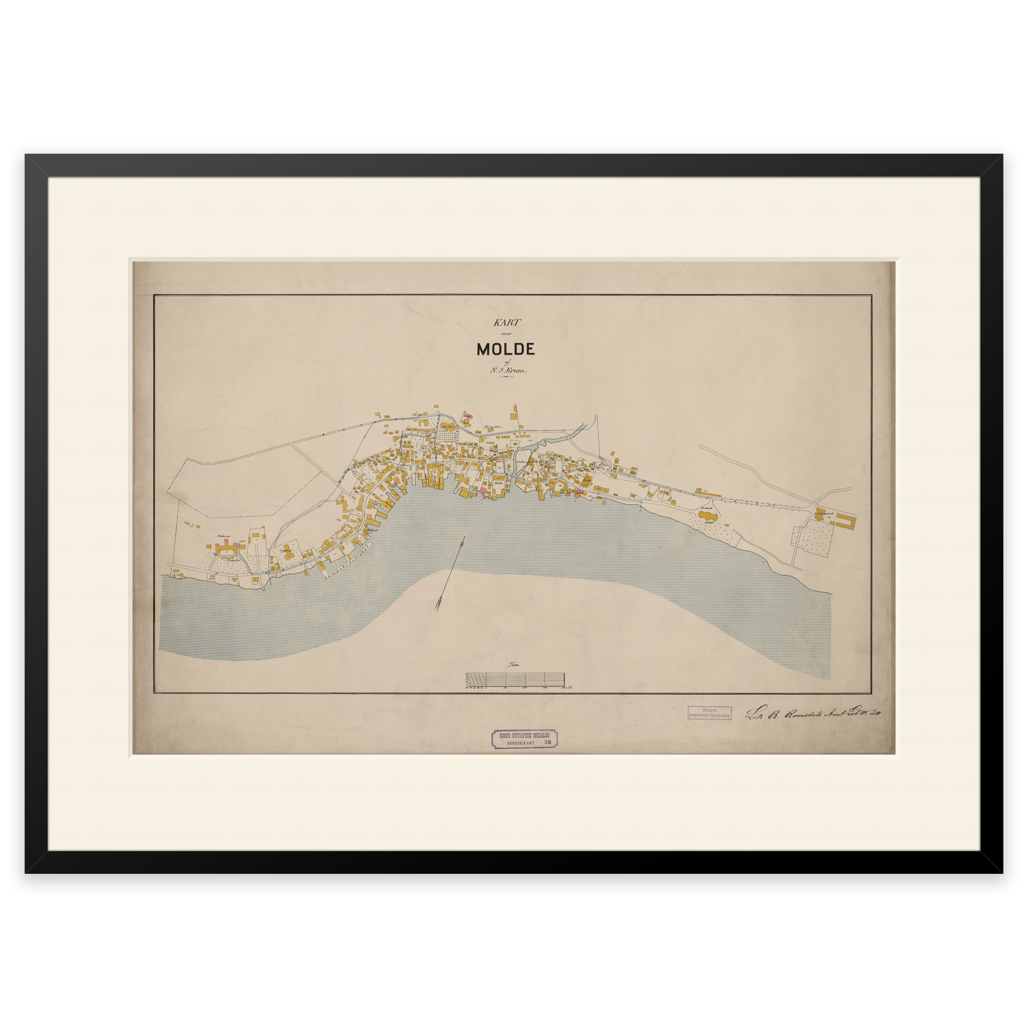 Dette litografiet viser Molde anno 1897. Kartet leveres i originalstørrelse 66,5 x 43 cm. Størrelsen med ramme og passepartout er 84,5 x 62 cm. Ønsker du kartet i en annen størrelse? Bare ta kontakt – vi gir deg gjerne et pristilbud på tilpasning.