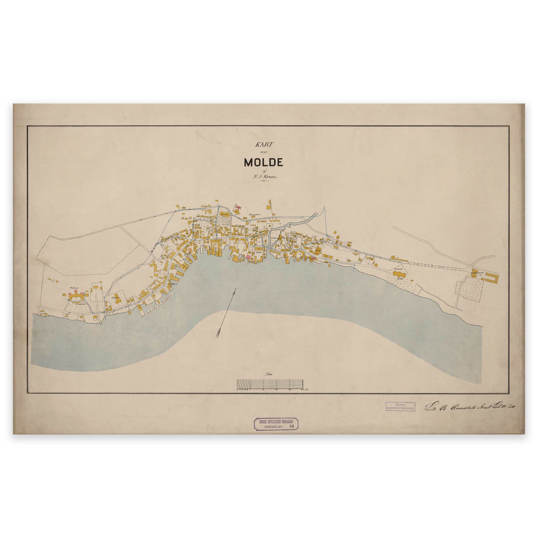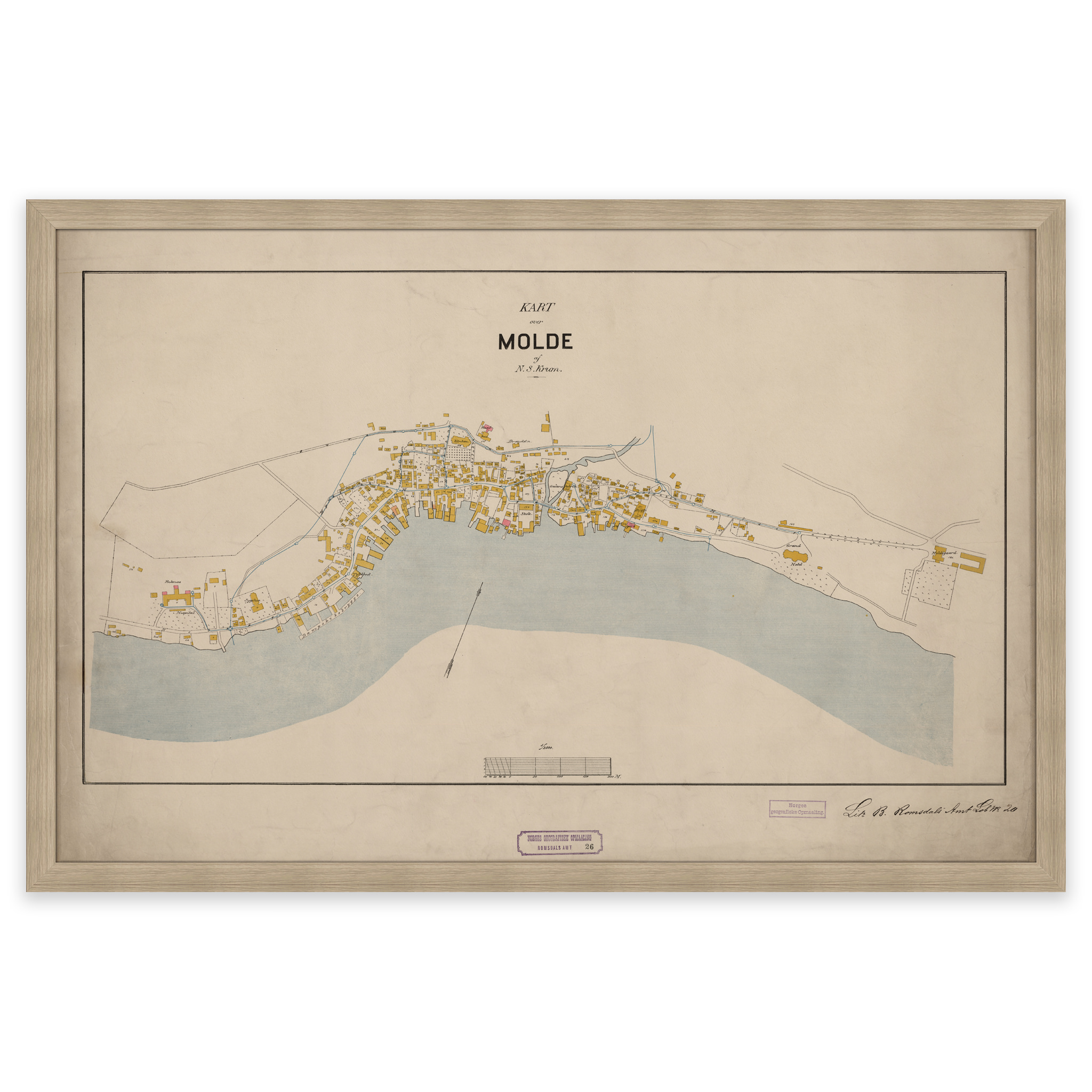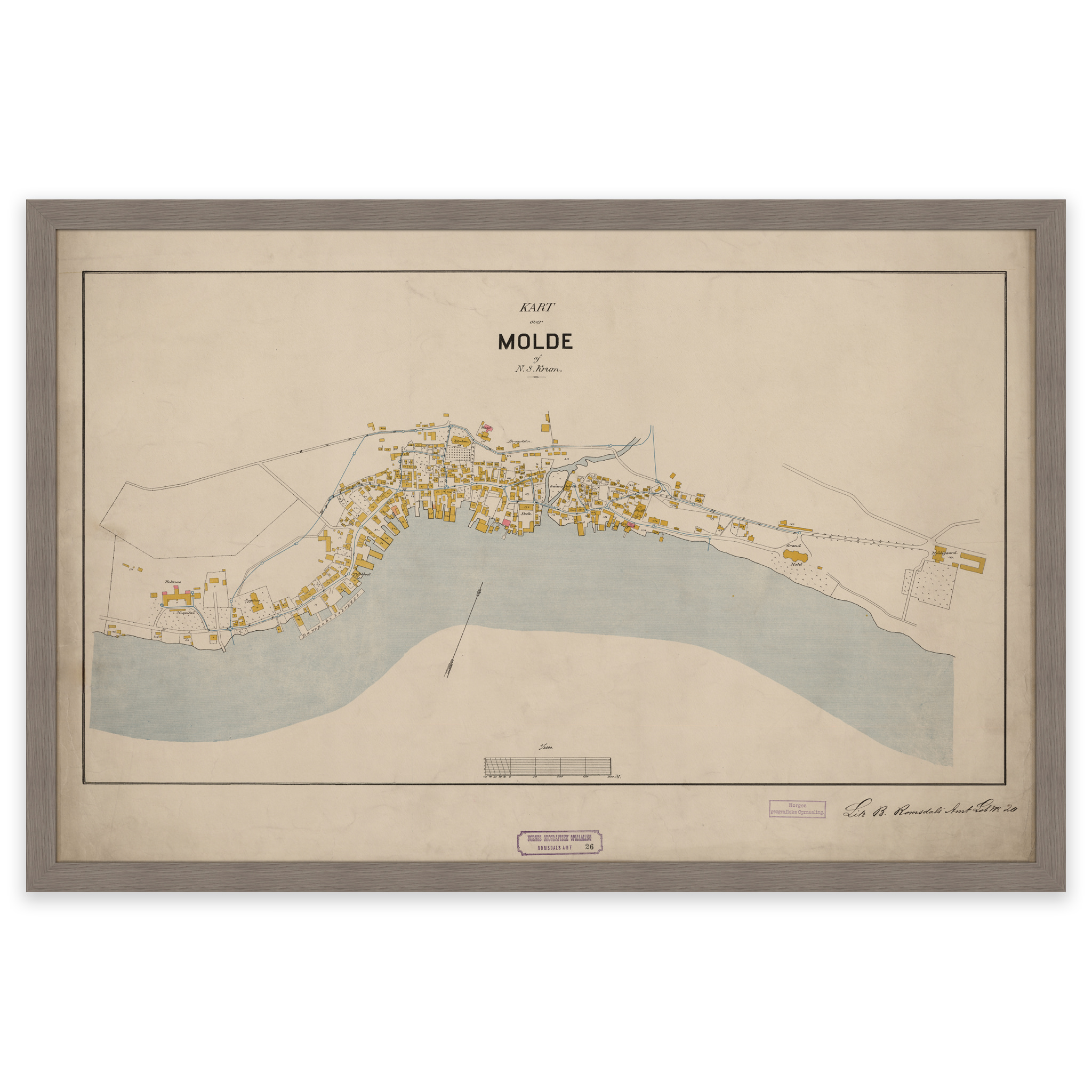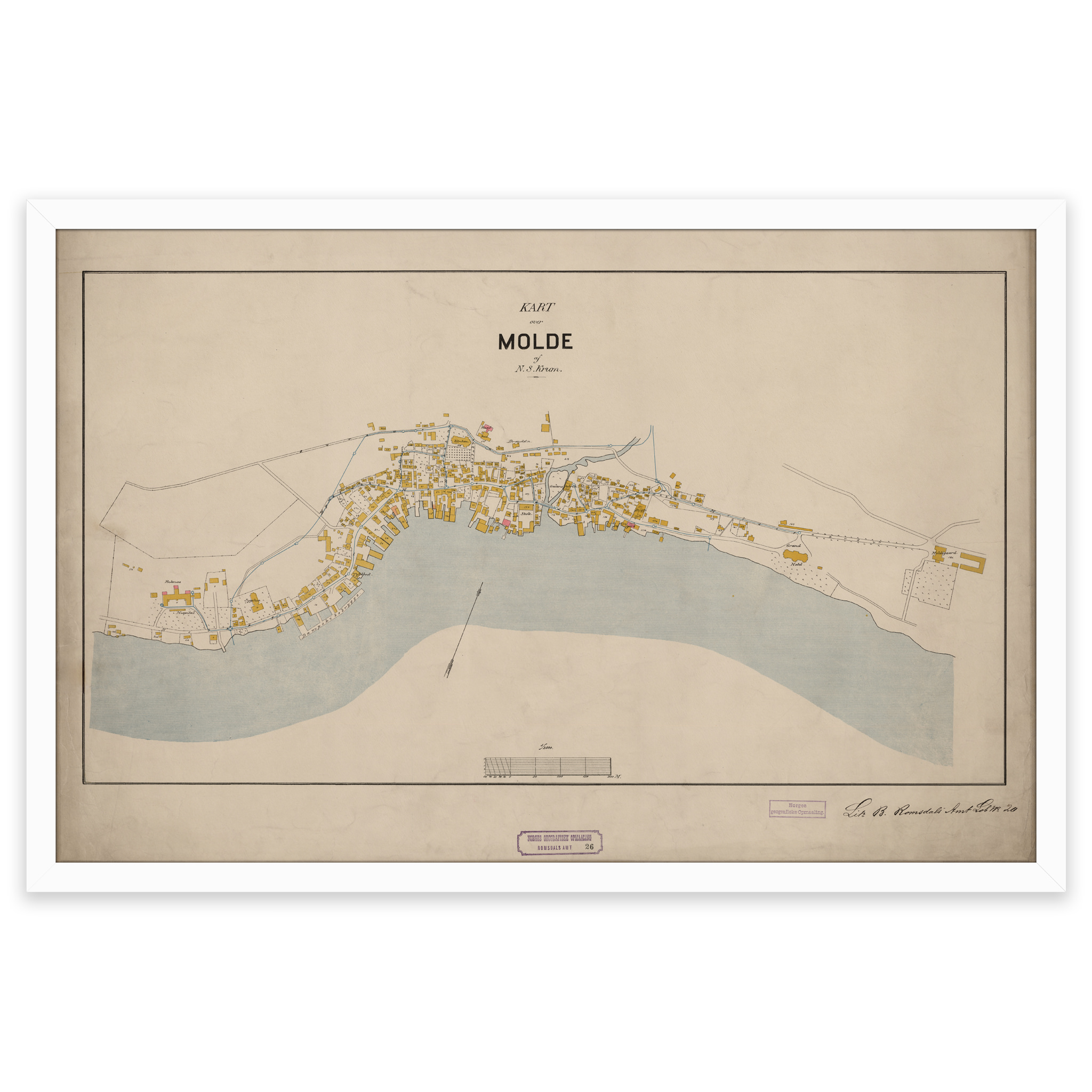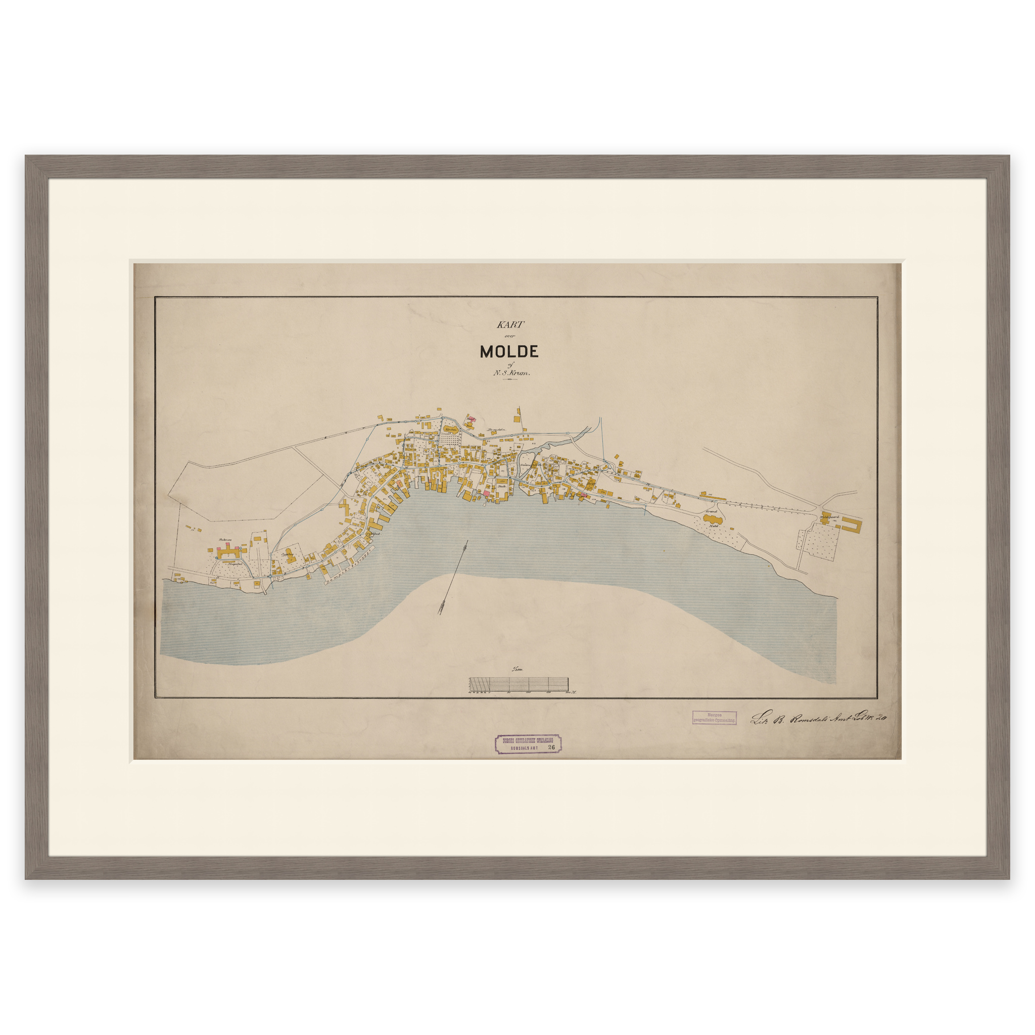 Dette litografiet viser Molde anno 1897. Kartet leveres i originalstørrelse 66,5 x 43 cm. Størrelsen med ramme og passepartout er 84,5 x 62 cm. Ønsker du kartet i en annen størrelse? Bare ta kontakt – vi gir deg gjerne et pristilbud på tilpasning.