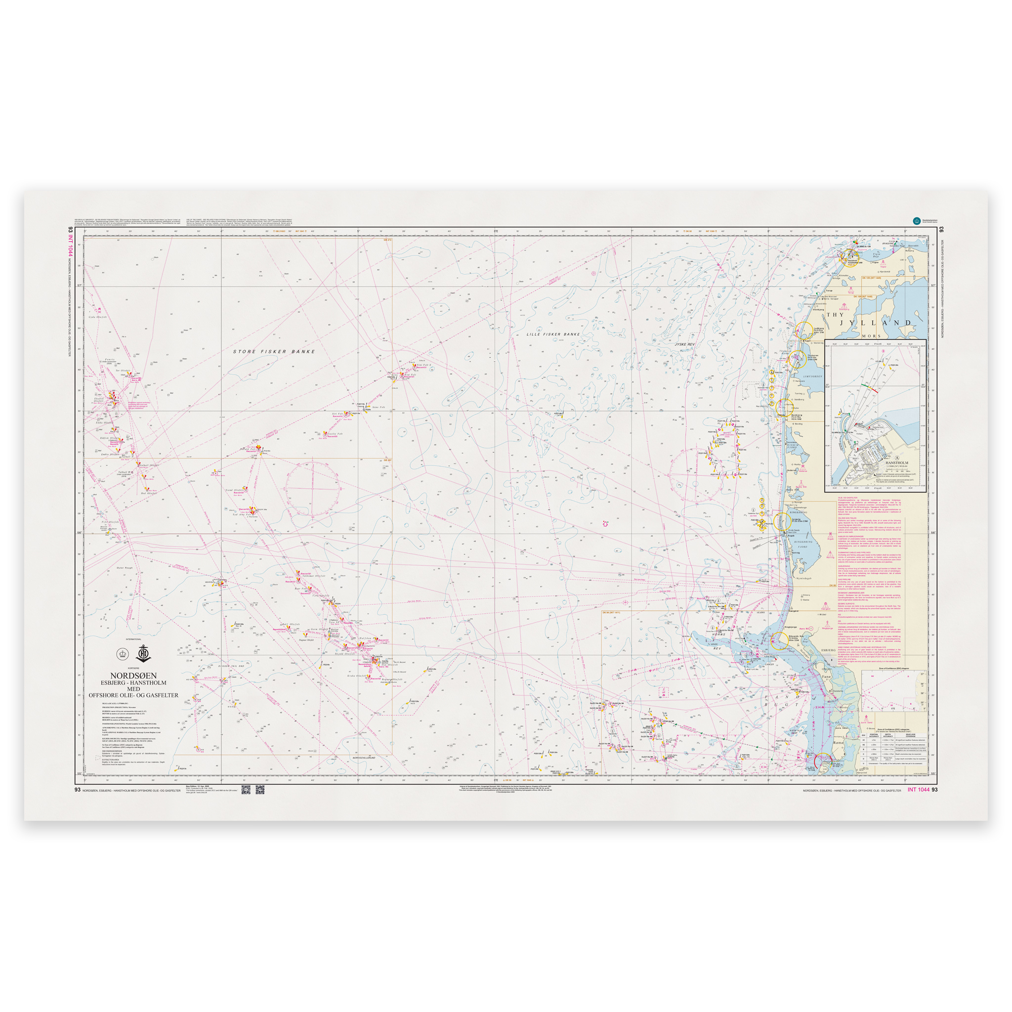 Kartet dekker den danske delen av Nordsjøen mellom Esbjerg og Hanstholm, inkludert områder med offshore olje- og gassfelt. Dette er et sentralt havområde for kommersiell skipsfart, offshore-installasjoner og energiproduksjon.