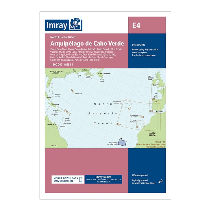 Dette oversiktskartet fra Imray dekker Kapp Verde-arkipelet og er utviklet spesielt for langturseilere og fritidsbåter som opererer i Nord-Atlanteren. Kartet gir et godt helhetsbilde av øygruppen og dens plassering i forhold til viktige seilingsruter mellom Europa, Afrika og Karibia.