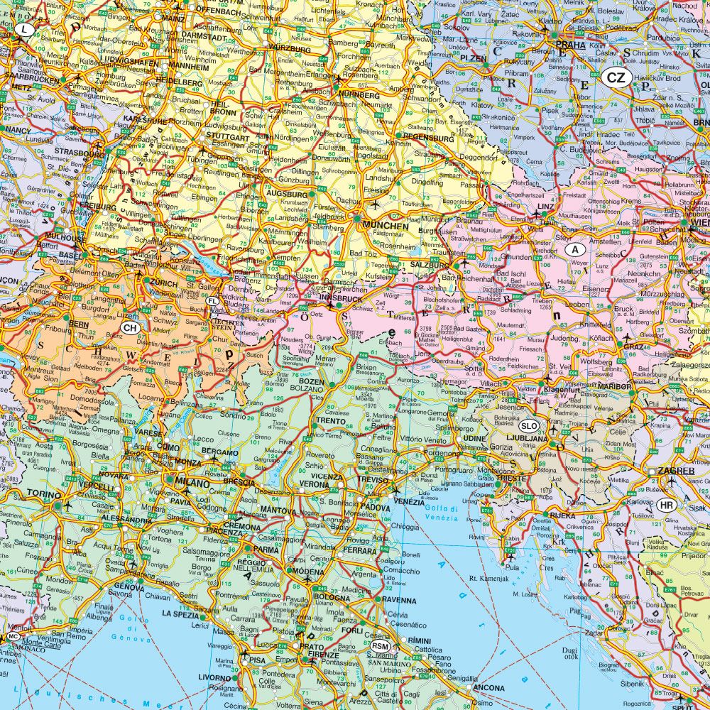 Kartet inneholder veinumre, avstander og utvalgte turistmål, og er godt egnet både til overordnet ruteplanlegging og praktisk bruk underveis. Kartteksten er flerspråklig og inkluderer stedsnavn på flere europeiske språk, noe som gjør kartet velegnet for bruk på tvers av landegrenser.