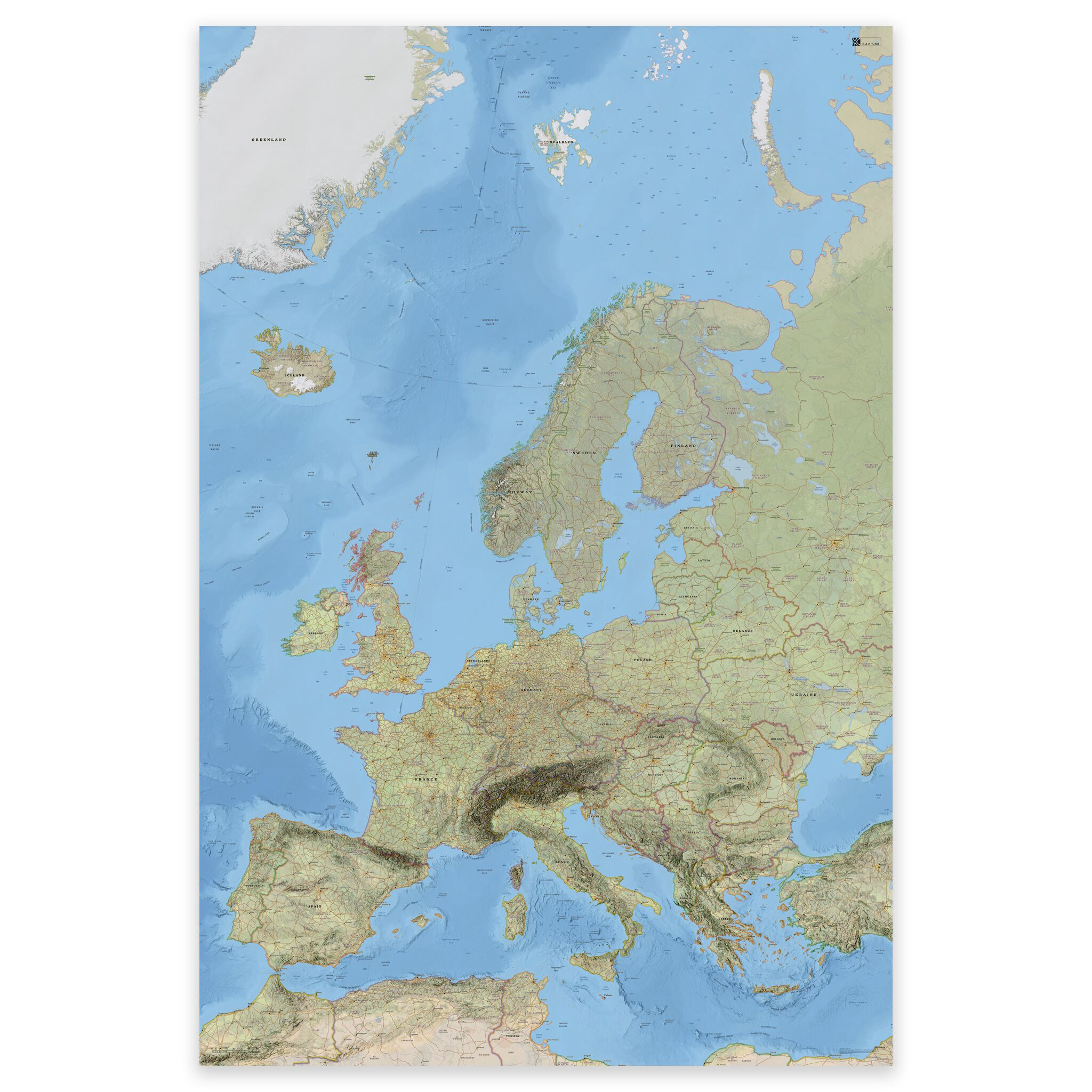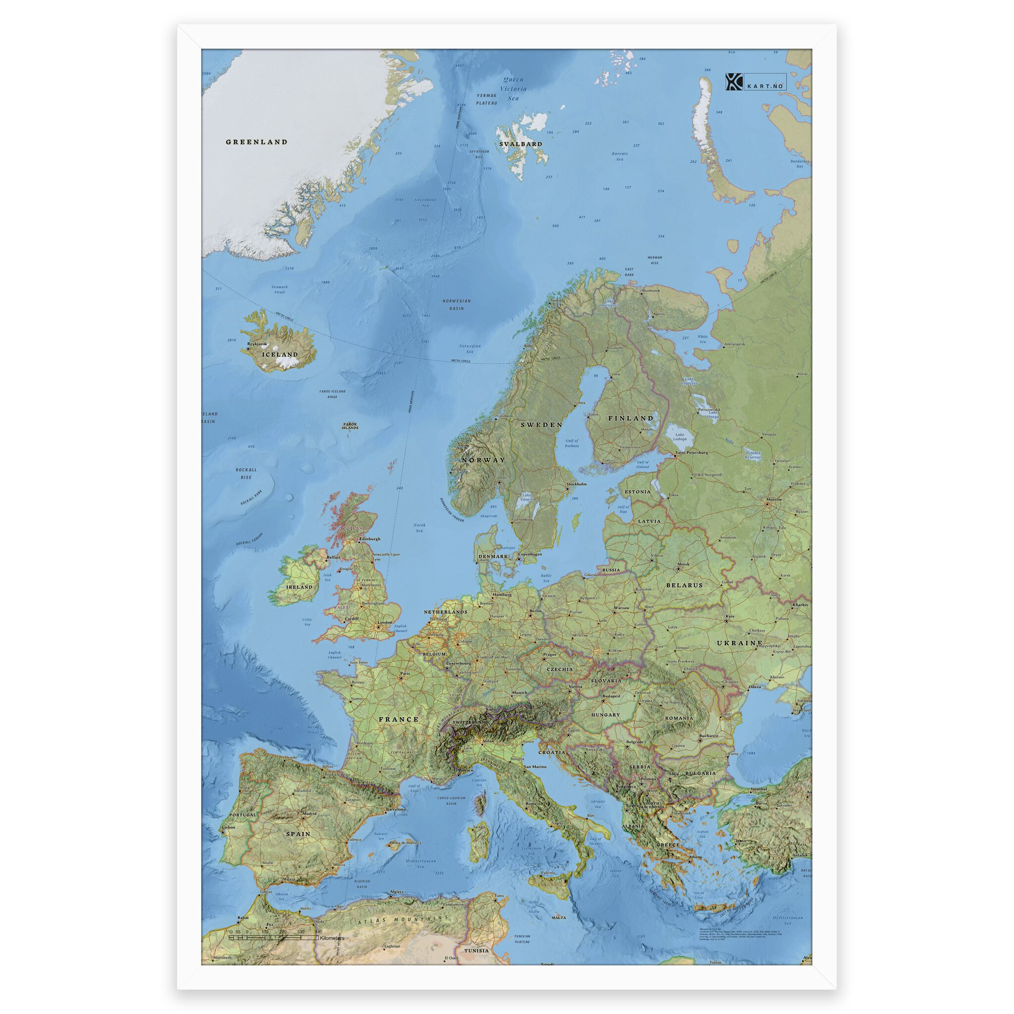 Kartet er laget i samme stil som vårt verdenskart, og kombinerer klassisk kartografi med moderne GIS-teknologi. Det viser land, grenser, byer og naturtrekk over hele Europa – fra Island i vest til Kaukasus i øst.