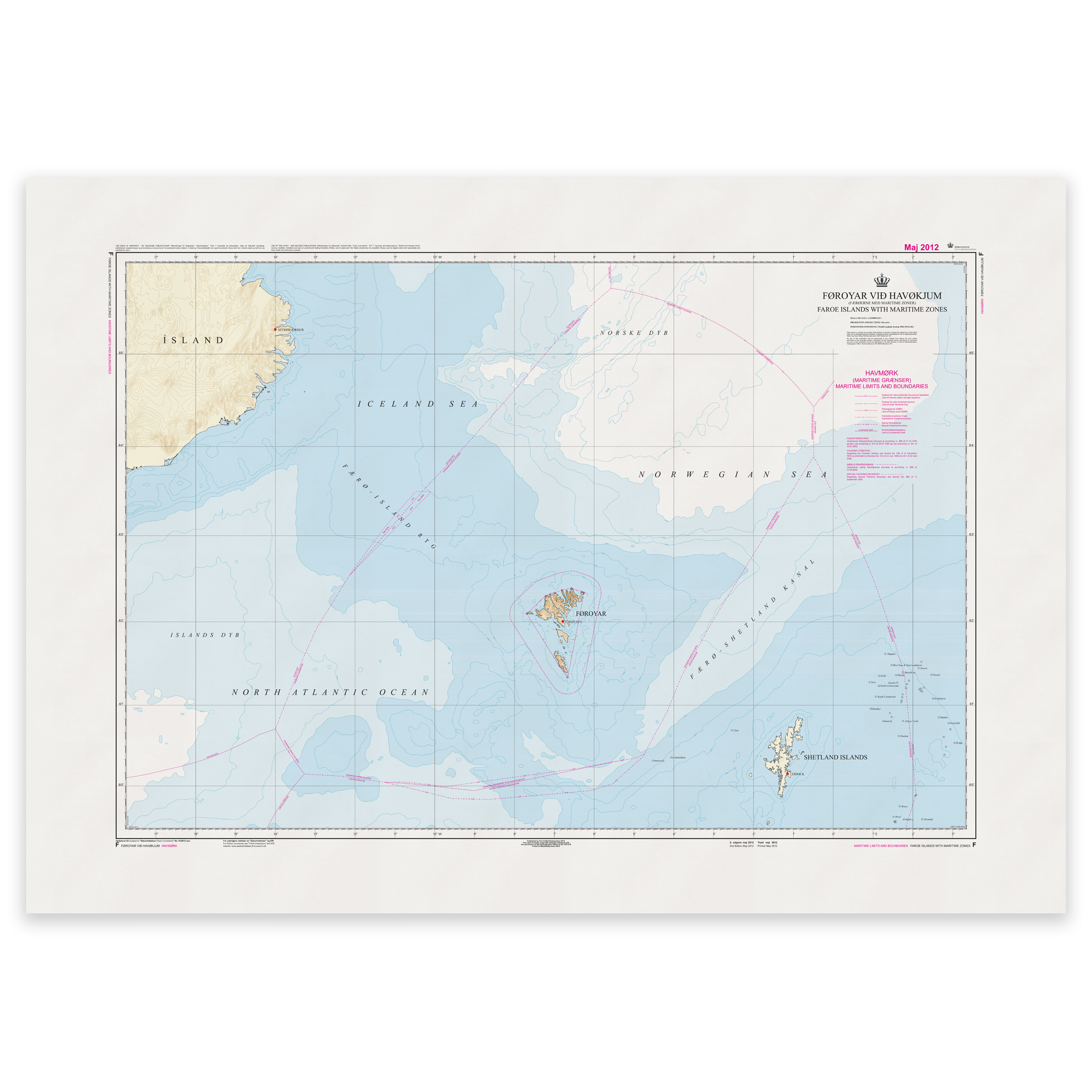 Faroe Islands Chart F – Faroe Islands with Maritime Zones er et offisielt sjøkart utgitt av Geodatastyrelsen i målestokk 1:1 150 000.
