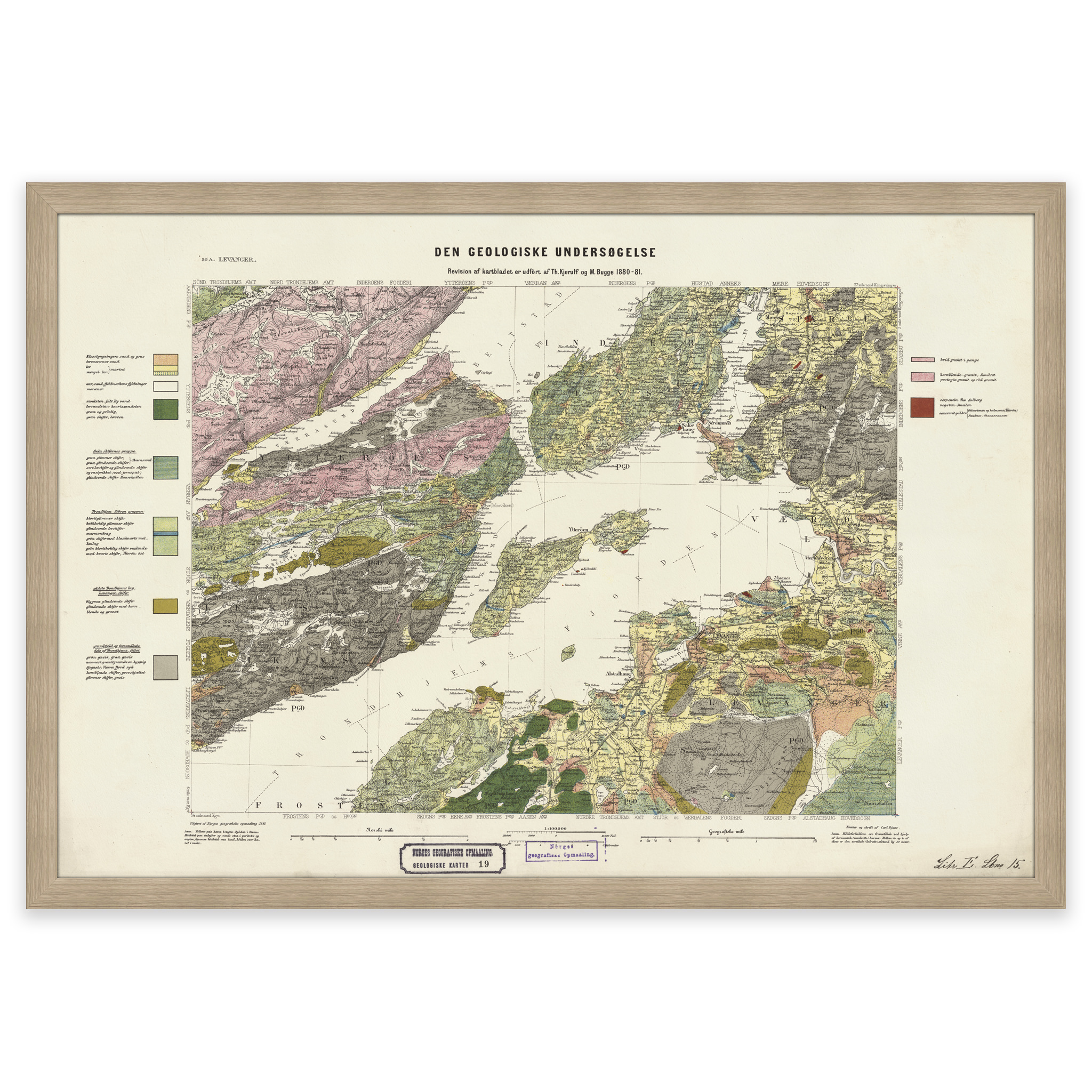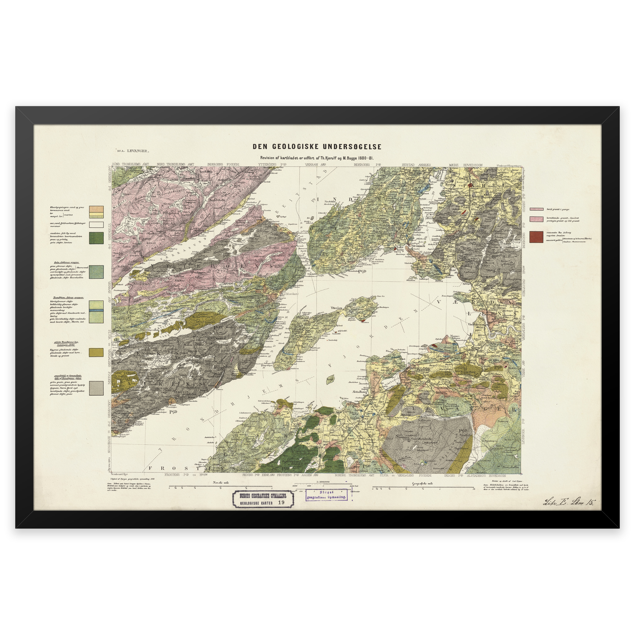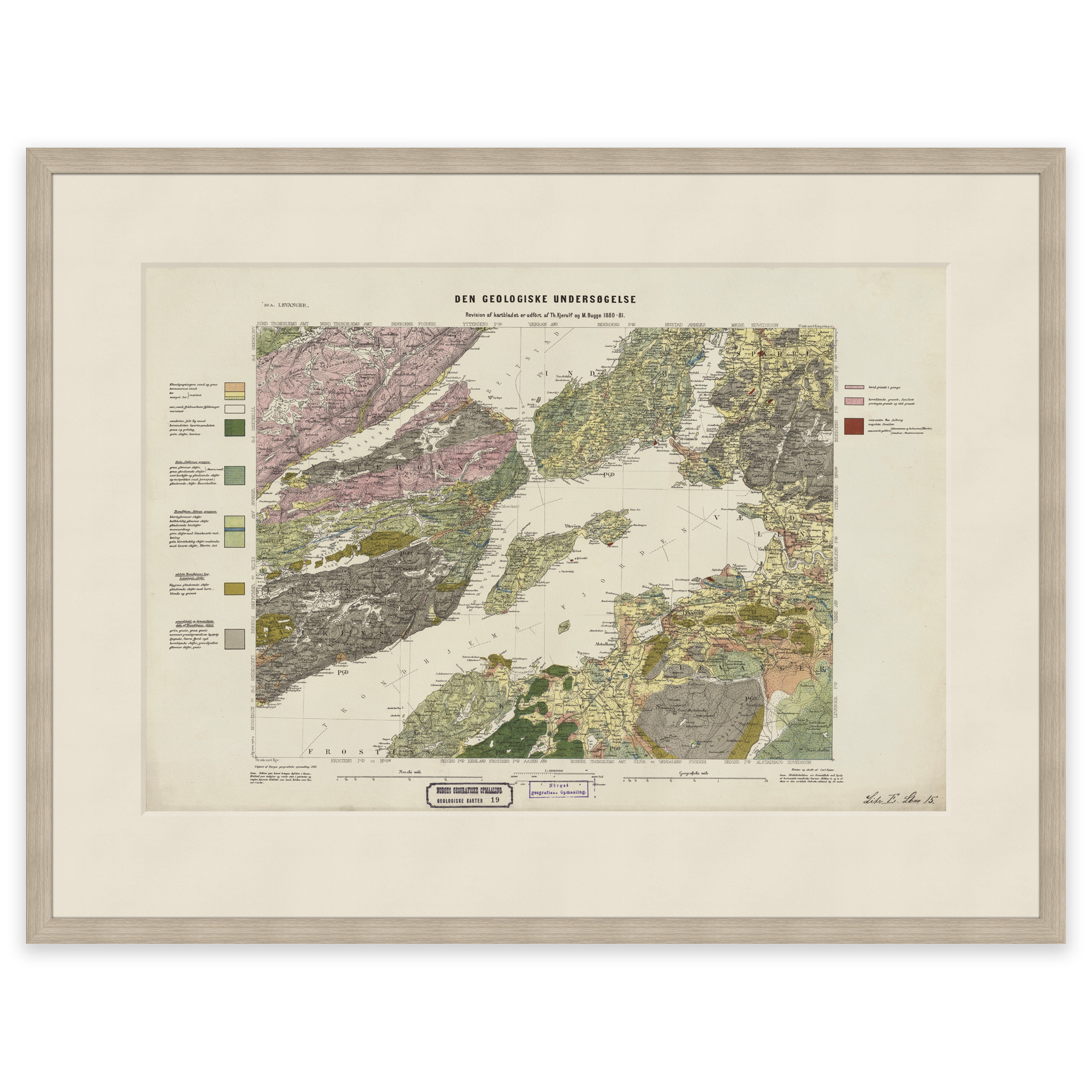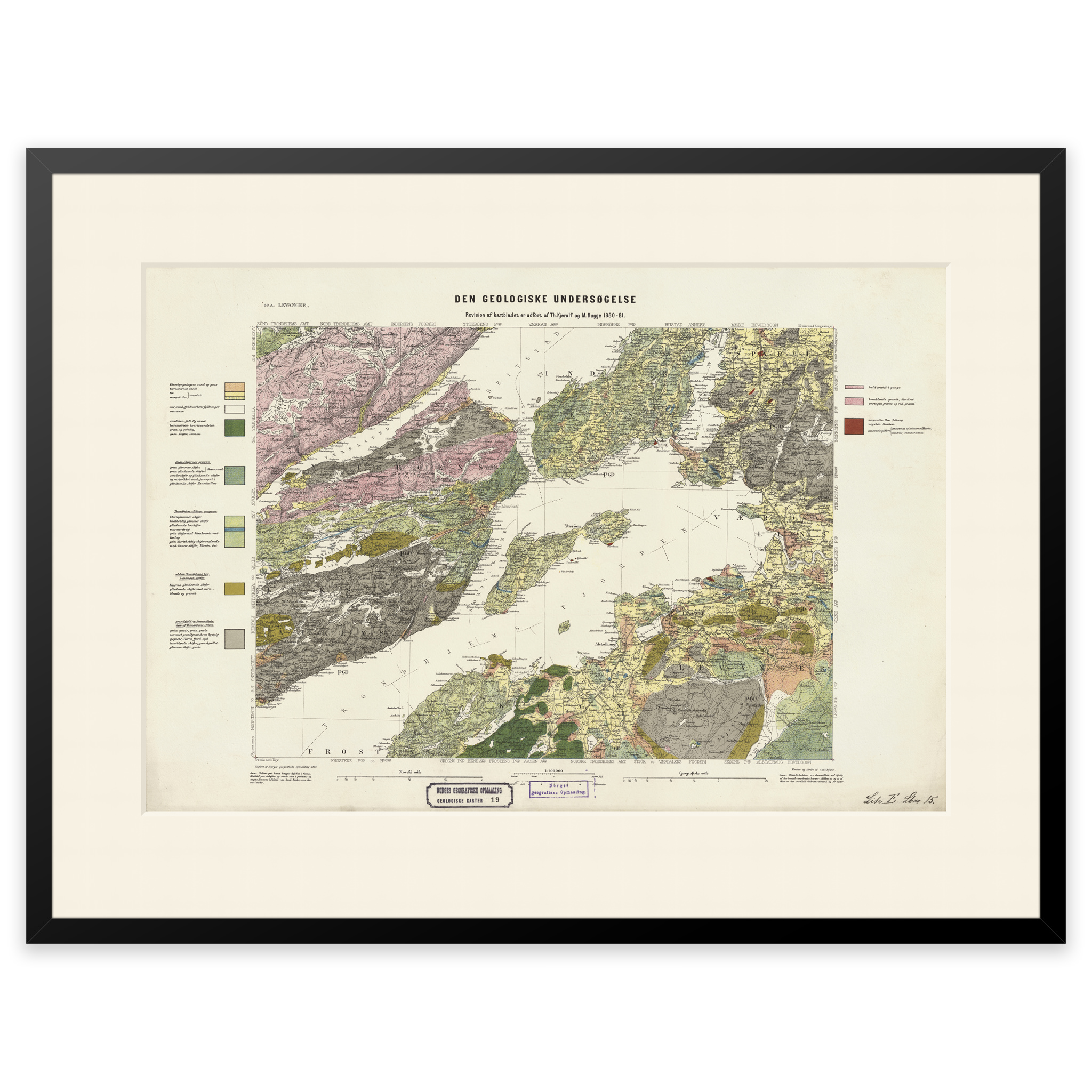 Geologisk kart over Levanger fra 1881. Kartet leveres i originalstørrelse 62,7 x 42,6 cm. Størrelsen med ramme og passepartout er 80,7 x 61,6 cm. Ønsker du kartet i en annen størrelse? Bare ta kontakt – vi gir deg gjerne et pristilbud på tilpasning.