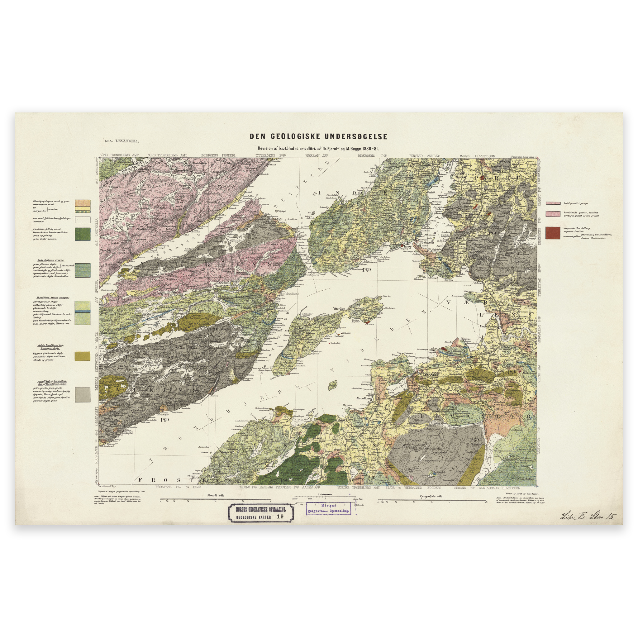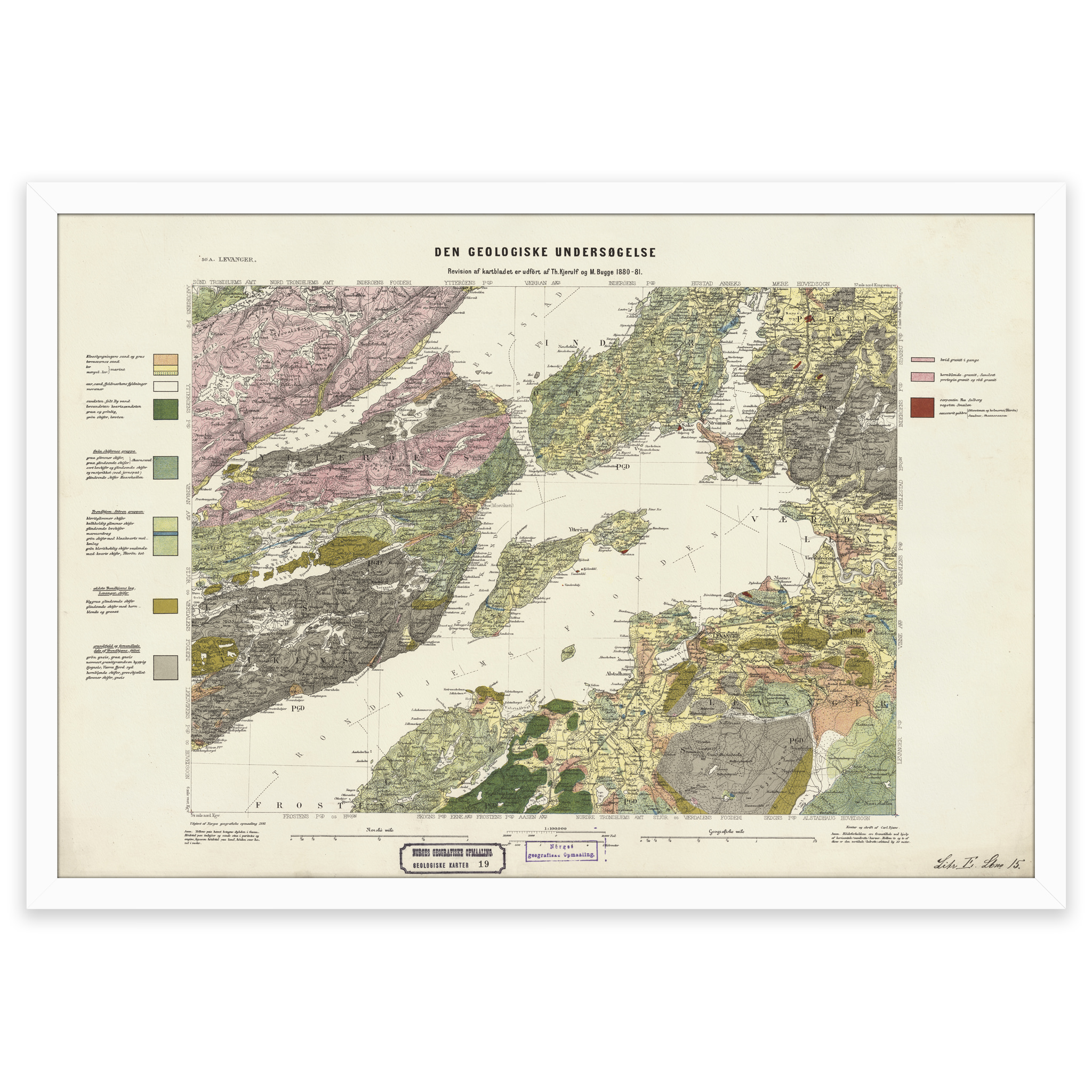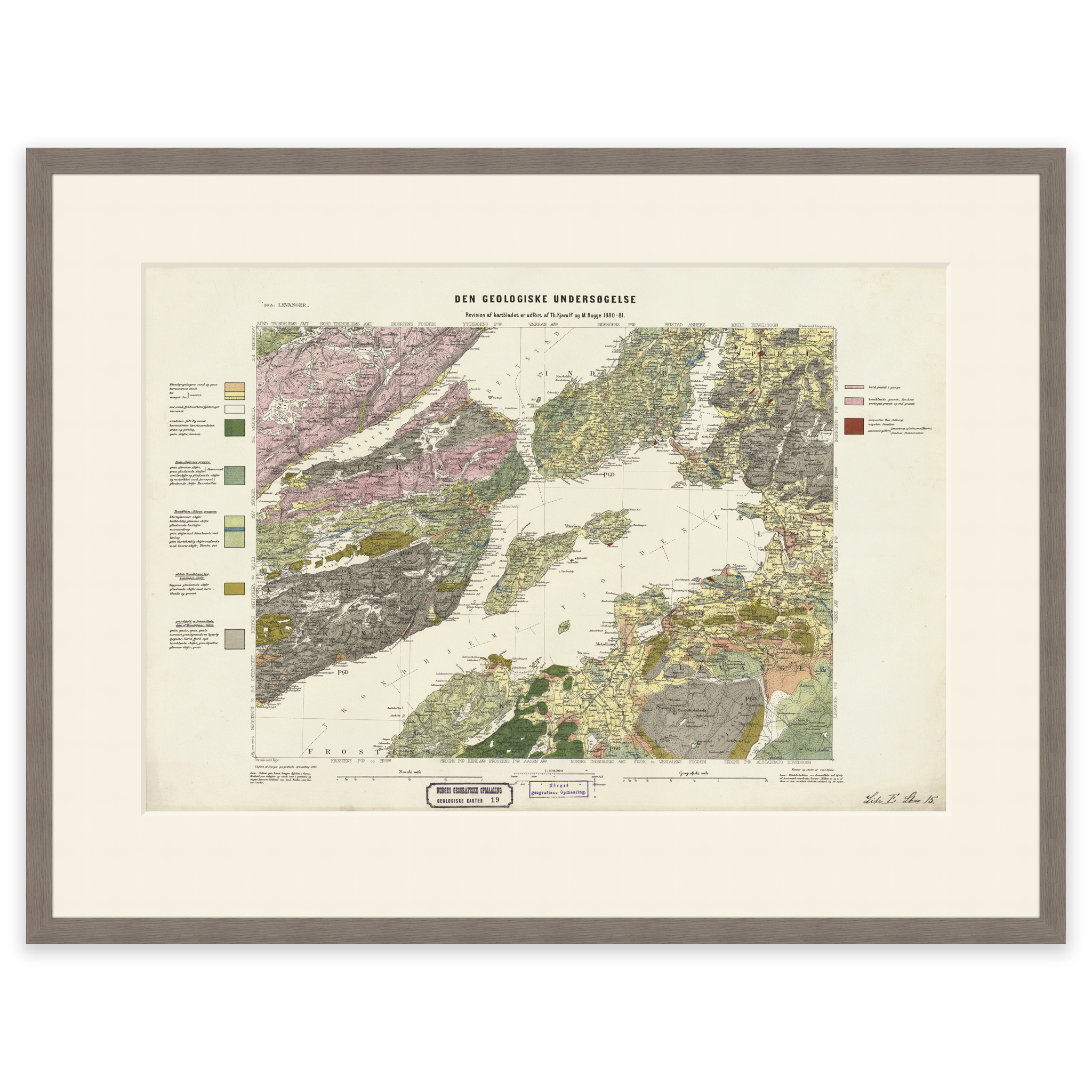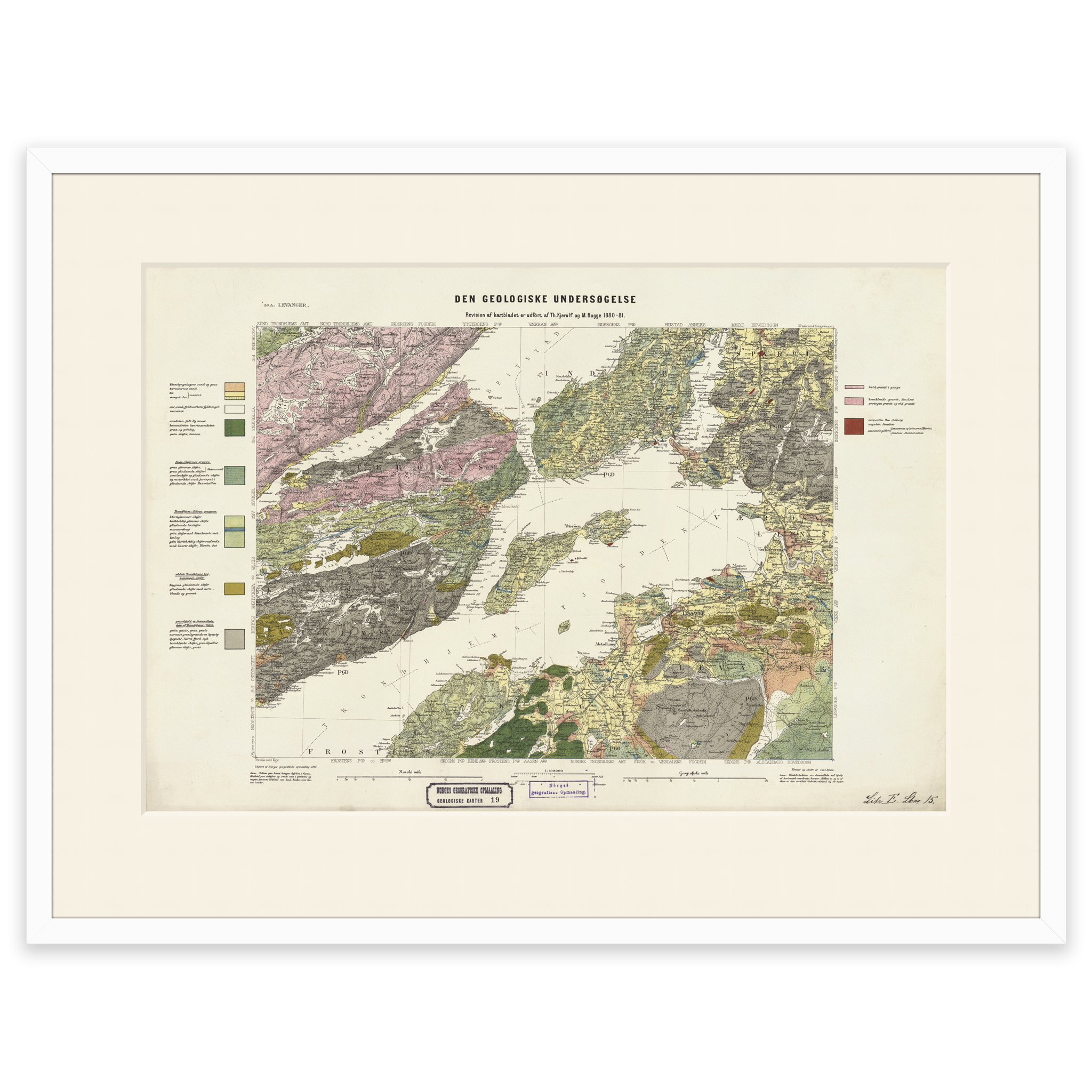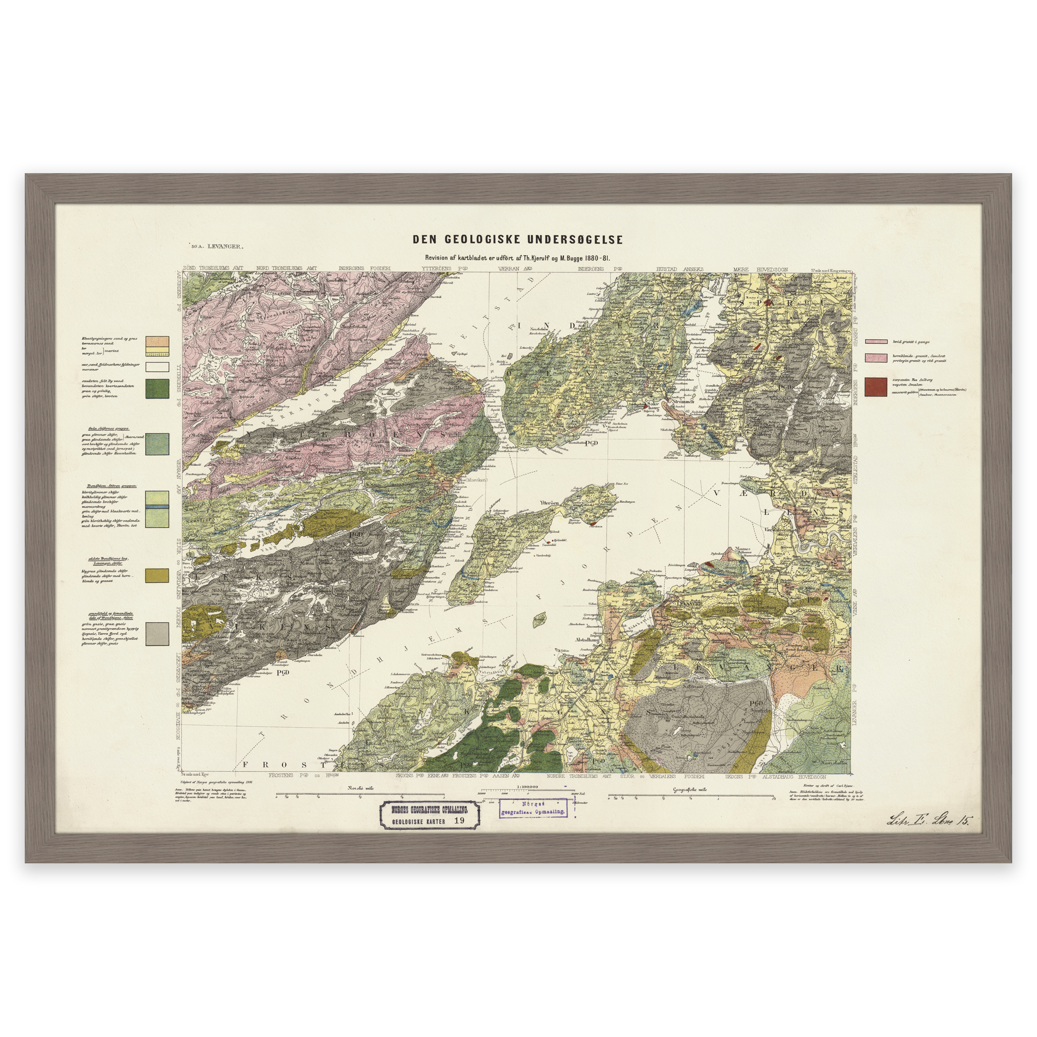 Geologisk kart over Levanger fra 1881. Kartet leveres i originalstørrelse 62,7 x 42,6 cm. Størrelsen med ramme og passepartout er 80,7 x 61,6 cm. Ønsker du kartet i en annen størrelse? Bare ta kontakt – vi gir deg gjerne et pristilbud på tilpasning.