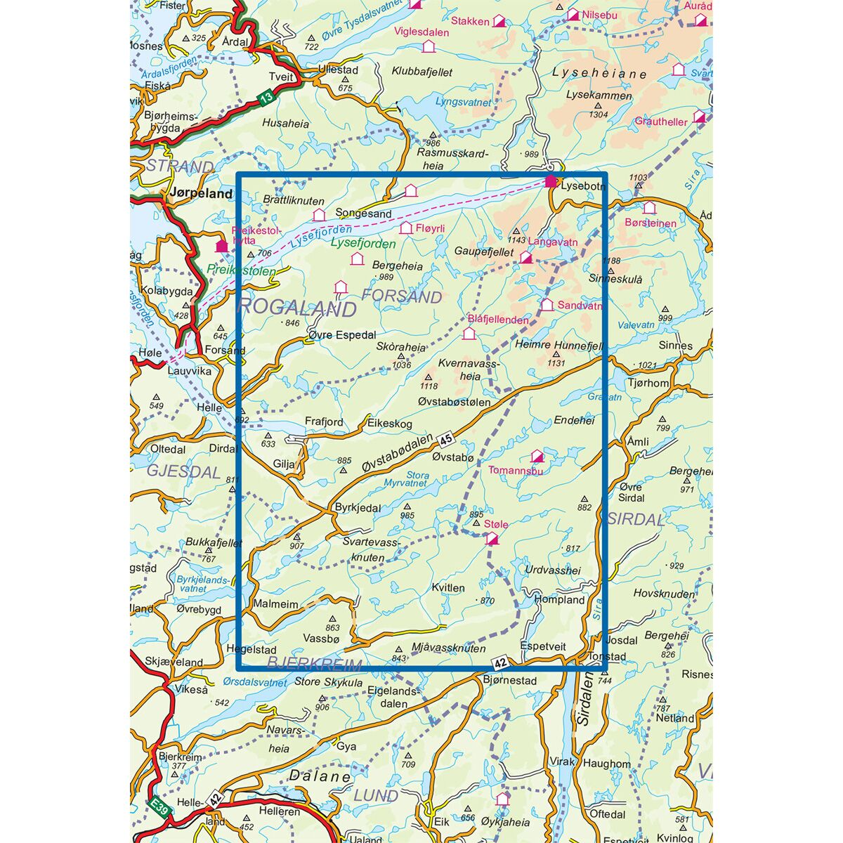 Kartet dekker steder som Frafjord, Lysebotn, Lysefjorden, Sira, Sirdalen, Tonstad og Øvstabødalen.