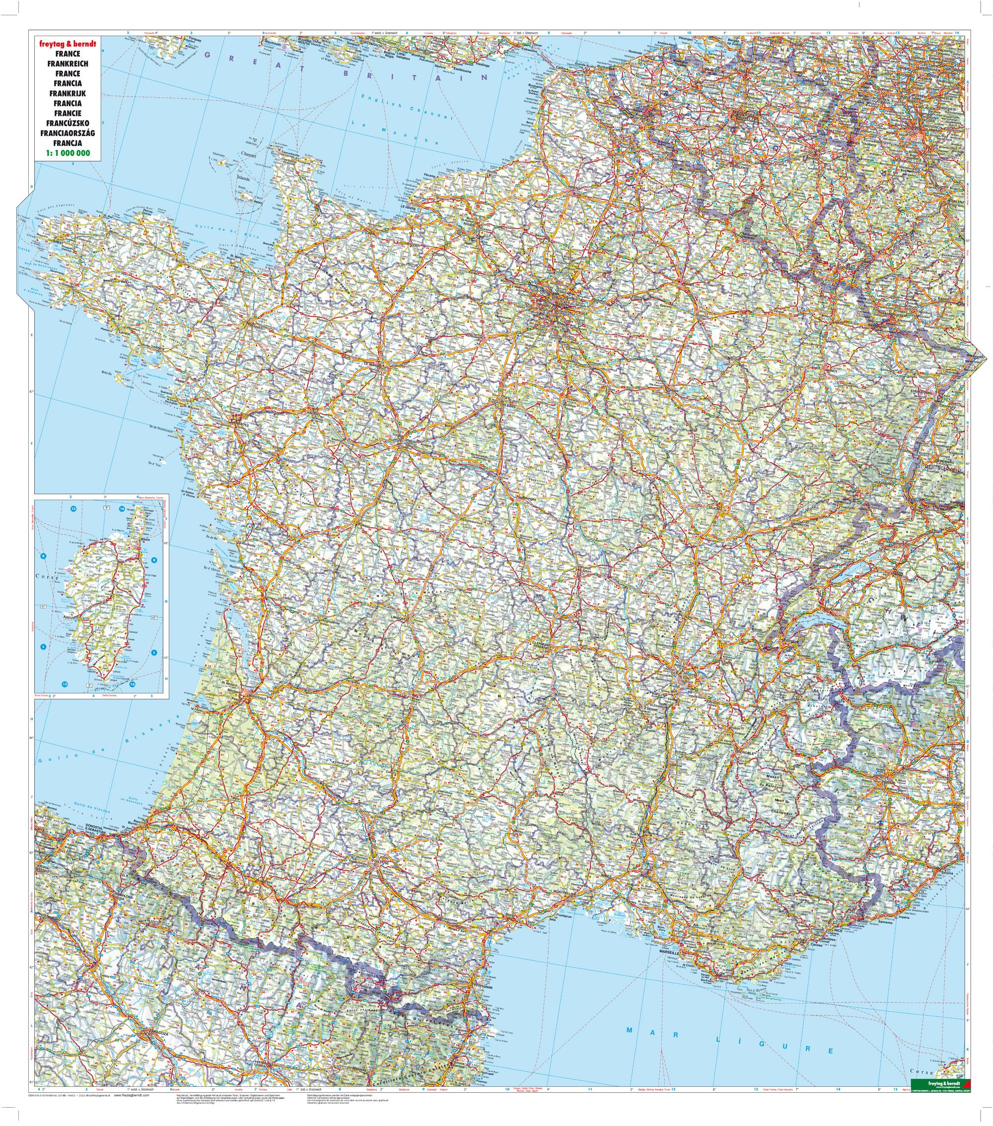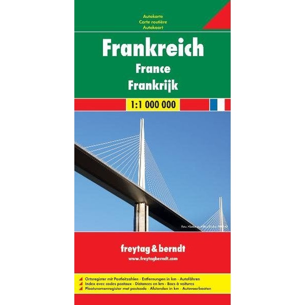 Dette er et detaljert og lettlest veikart over Frankrike, utviklet for reisende som ønsker god oversikt over hele landet i ett samlet kart. Kartet dekker hele Frankrike i målestokk 1:1 000 000 og viser hovedveier, motorveier, byer, elver, innsjøer og fjellområder i en tydelig og oversiktlig kartografi.