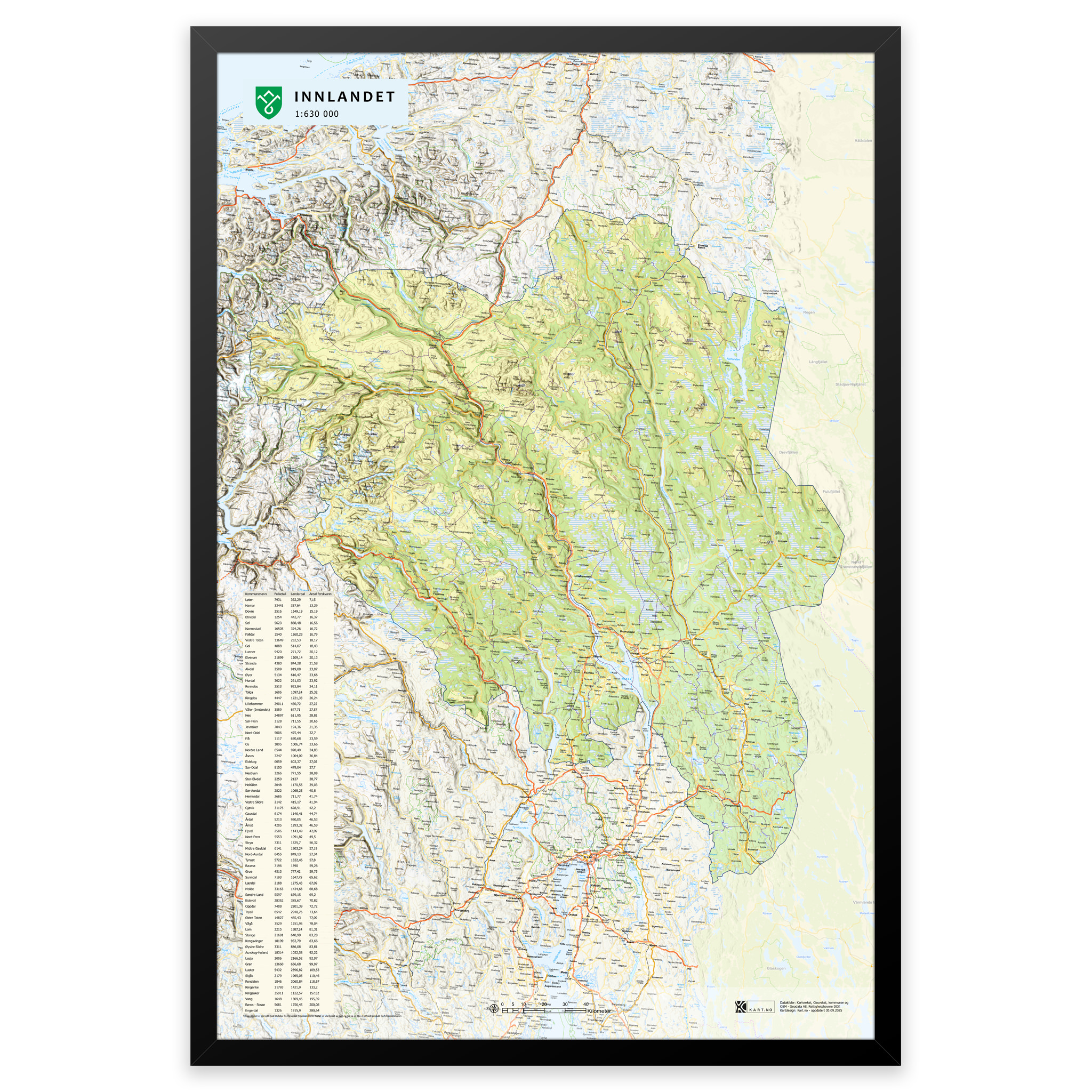 Kartet viser hele Innlandet fylke med tydelige kommunegrenser og oppdatert inndeling. Lages på bestilling med oppdaterte kartdata fra Kartverket – alltid ajour med kommune- og fylkesgrenser. De topografiske terrengskyggene gir en naturtro og tredimensjonal effekt.