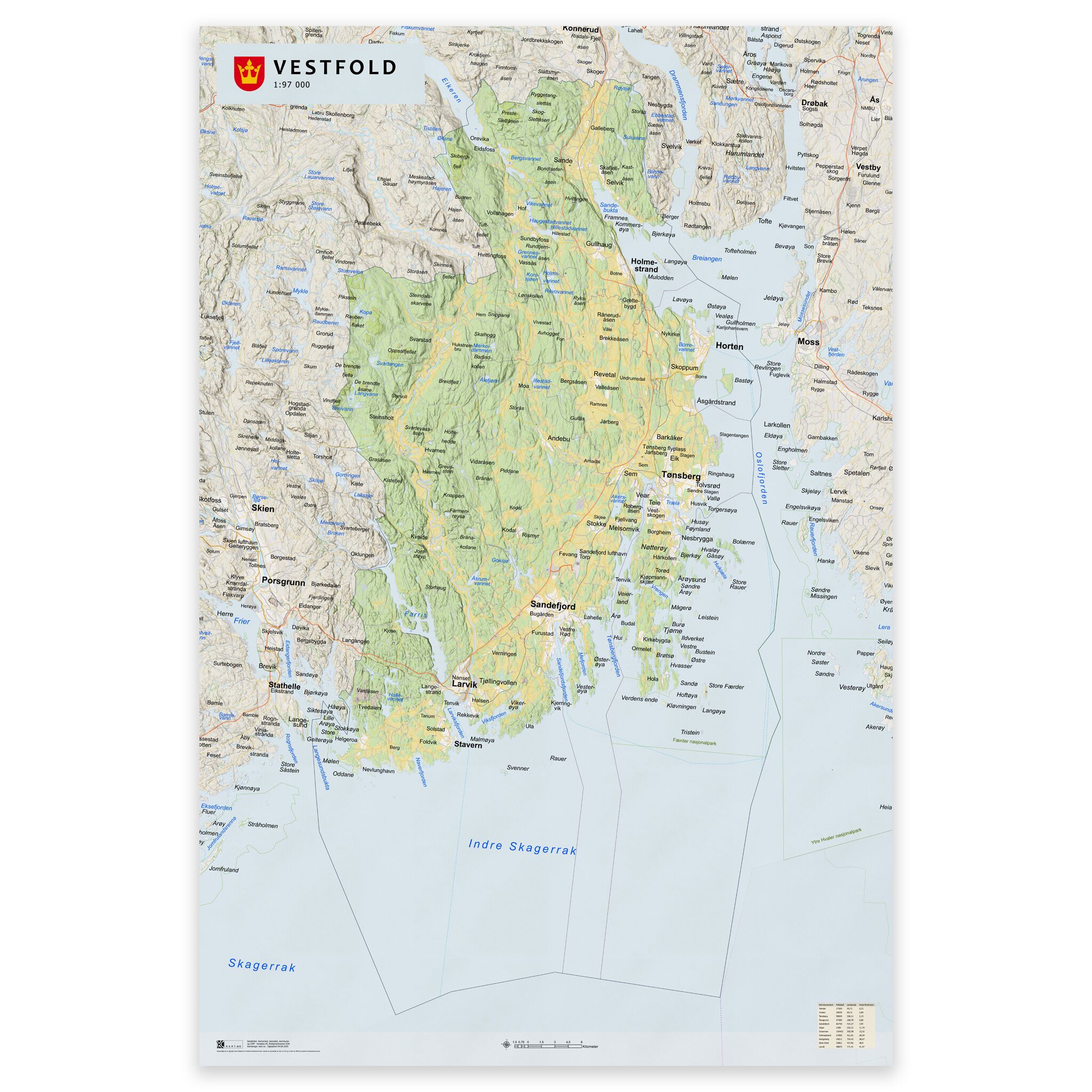 Stilrent og detaljert kart over Vestfold – tilgjengelig i fem størrelser.