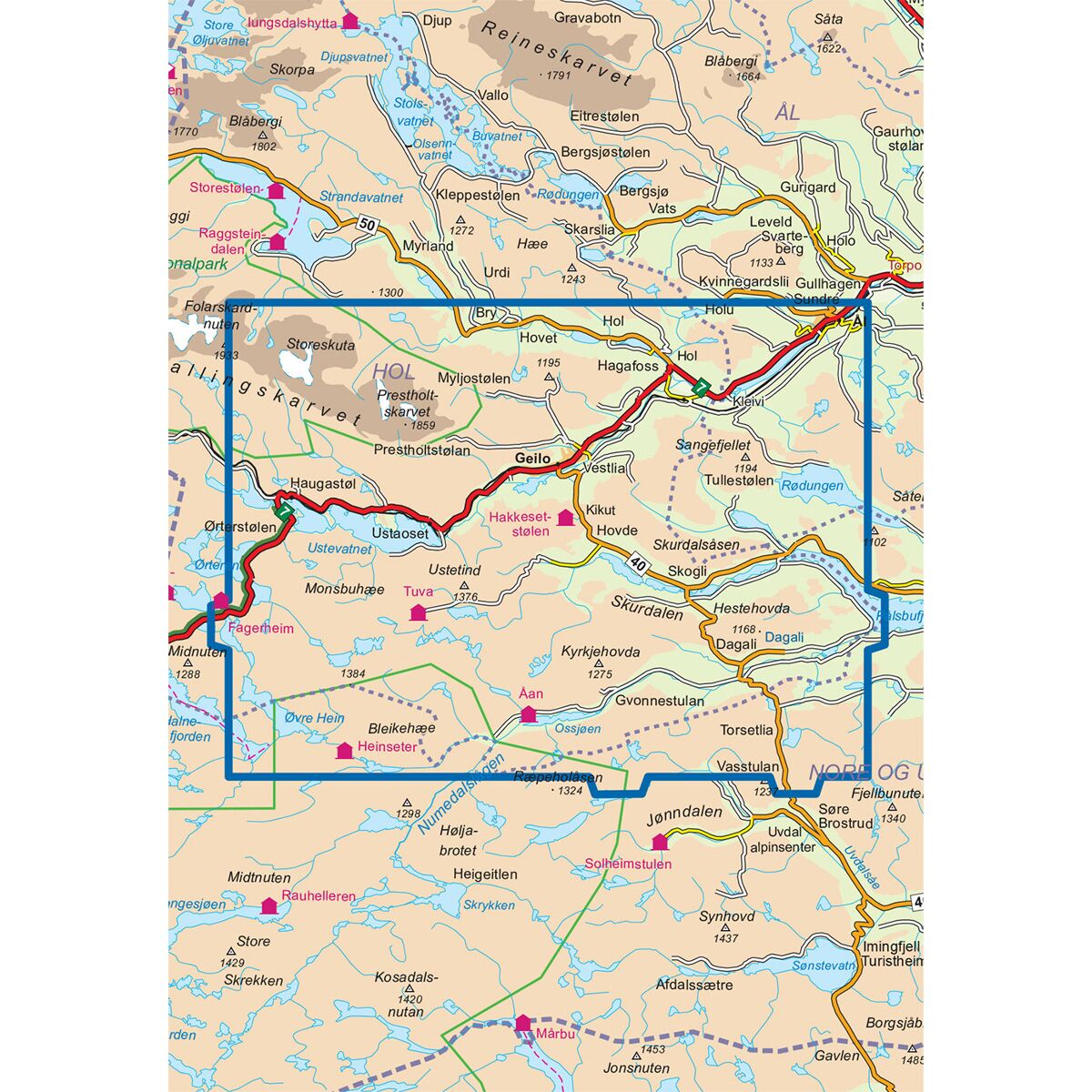 Kartet dekker steder som Dagali, Folarskardnuten, Geilo, Hallingdal, Hol, Numedalslågen, Rødungen, Ustevatnet og Ål.