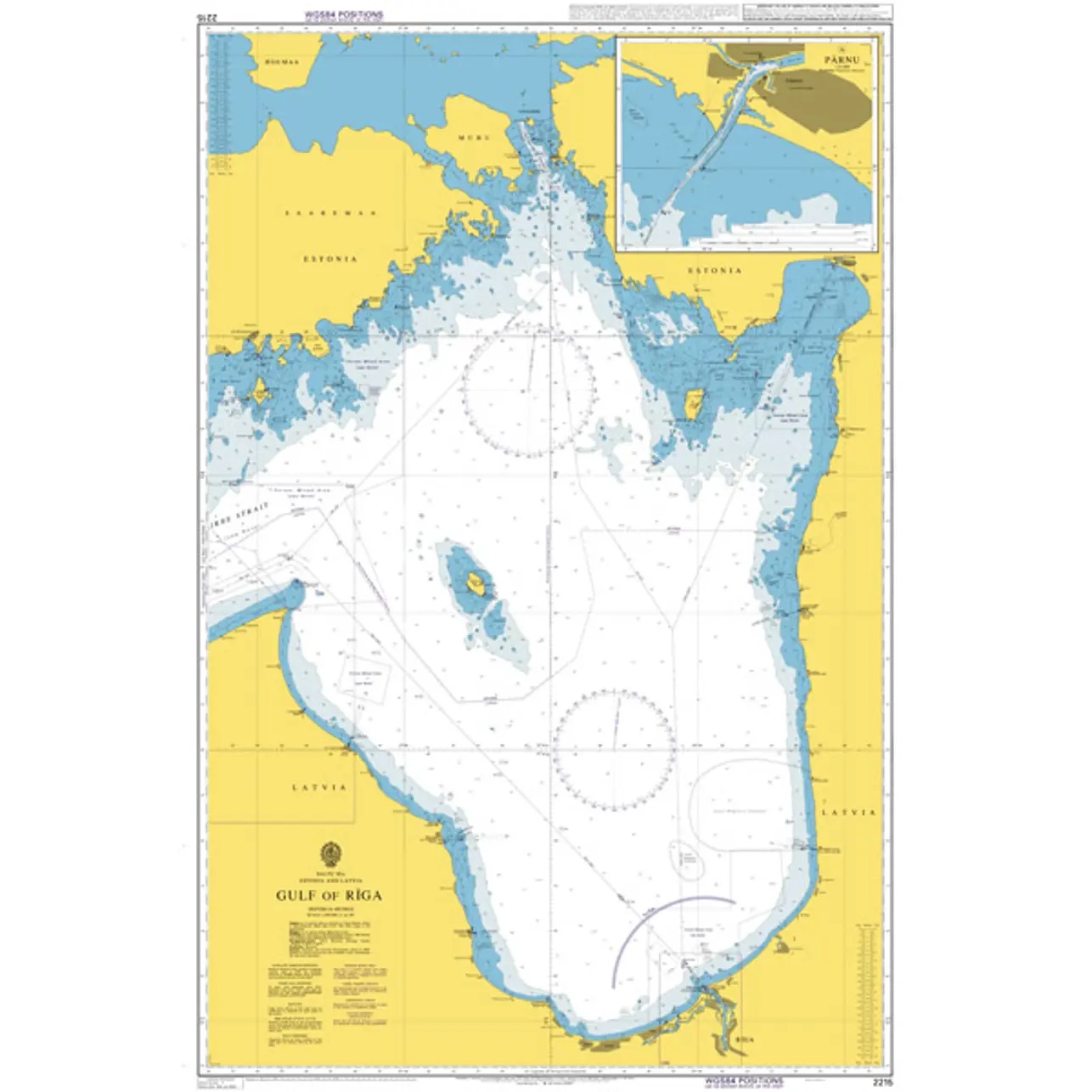 Dette British Admiralty-sjøkartet dekker Rigabukta i Østersjøen, inkludert kystområdene langs Latvia og Estland samt innseilingene mot større havner i regionen. Kartet viser dybdeforhold, grunner, navigasjonsmerker, trafikkleder og øvrige viktige detaljer for trygg navigasjon i et relativt grunt og trafikkert farvann.