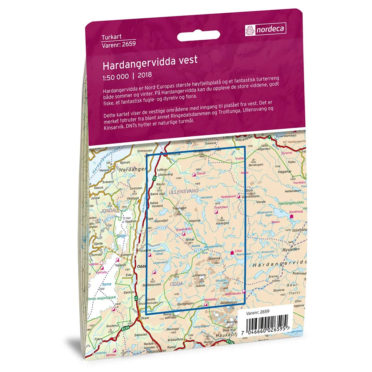 Hardangervidda er Nord-Europas største høyfjellsplatå og et fantastisk tur­terreng både sommer og vinter. På Hardangervidda kan du oppleve de store viddene, godt fiske, et fantastisk fugle- og dyreliv og flora. Dette kartet viser de vestlige områdene med inngang til platået fra vest. Det er merket fotruter fra blant annet Odda, Ullensvang og Kinsarvik. DNTs hytter er naturlige turmål. Mange av turene i kartet har timeangivelser.Innenfor kartet finner du bl.a. fergestrekninger, Munkatreppene, Hardangervidda Nasjonalpark, Ringedalsvatnet, Trolltunga, Trolltunga Zippen, Hårteigen, Tyssebotn, Nosi og Einseten.