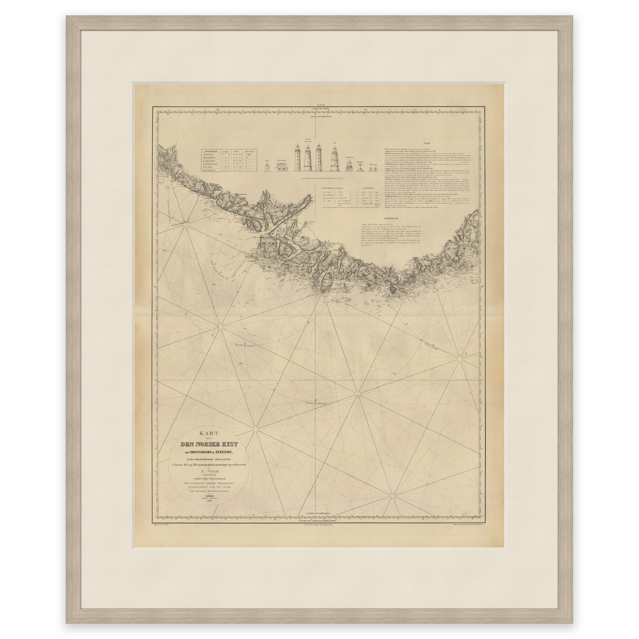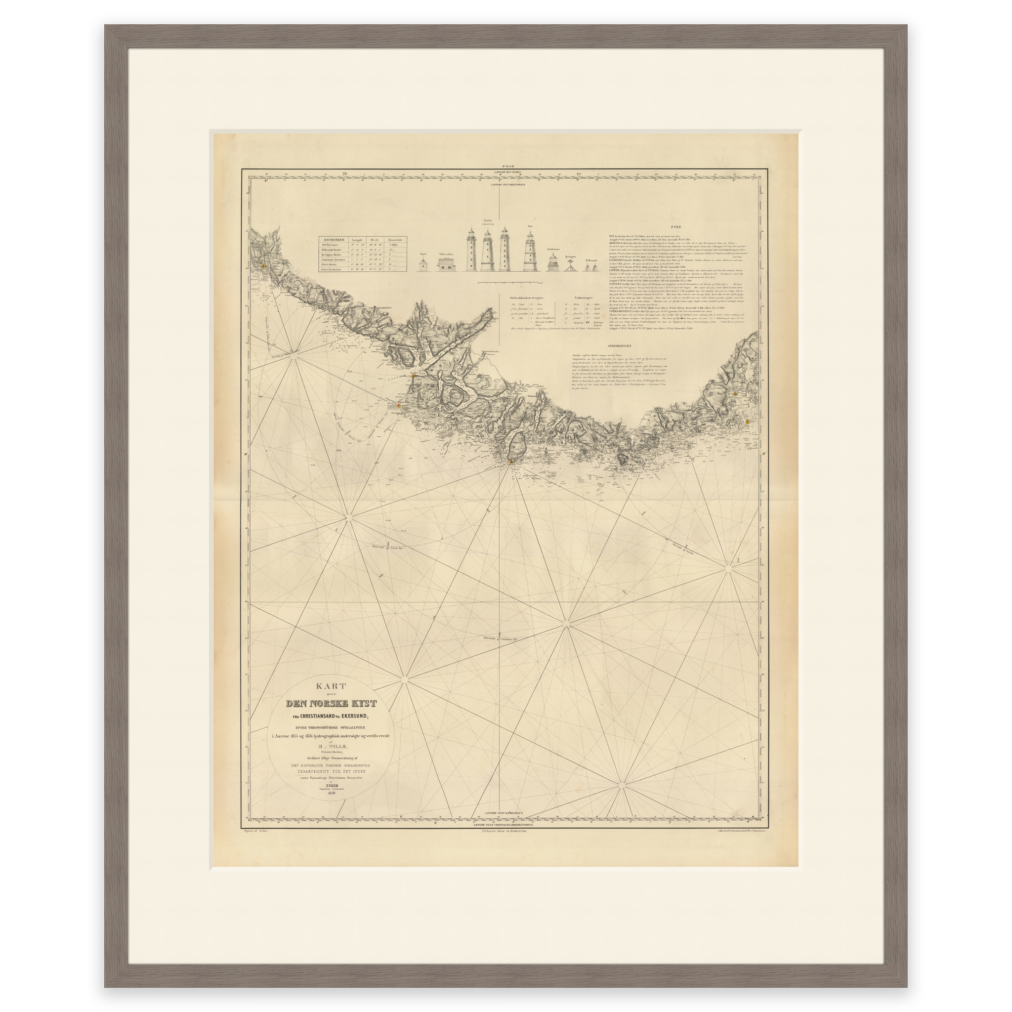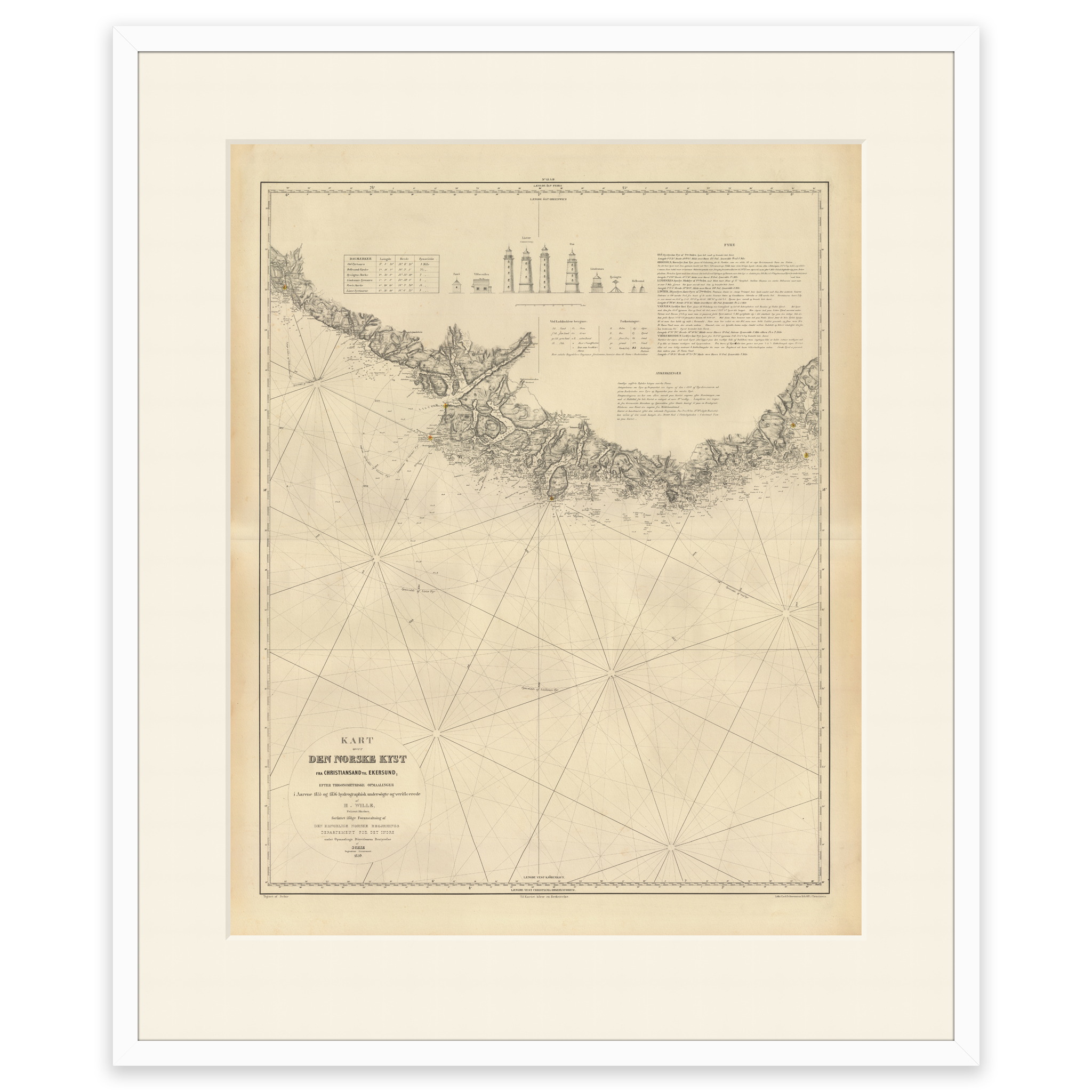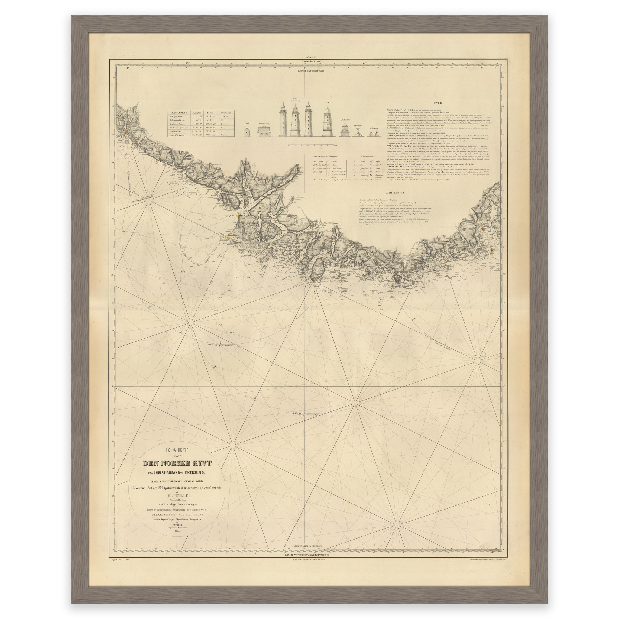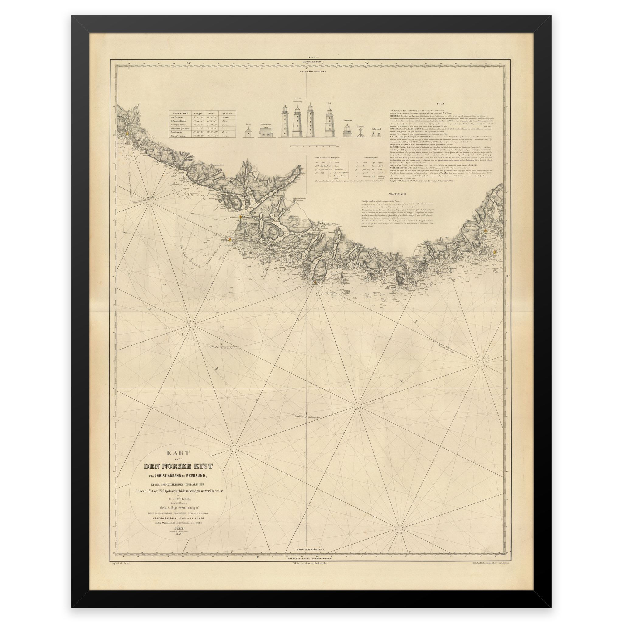 Dette kartet er laget i 1859 og dekker området mellom Kristiansand og Egersund. Kartet leveres i originalstørrelse 50,2 x 63 cm. Størrelsen med ramme og passepartout er 68,2 x 82 cm. Ønsker du kartet i en annen størrelse? Bare ta kontakt – vi gir deg gjerne et pristilbud på tilpasning.