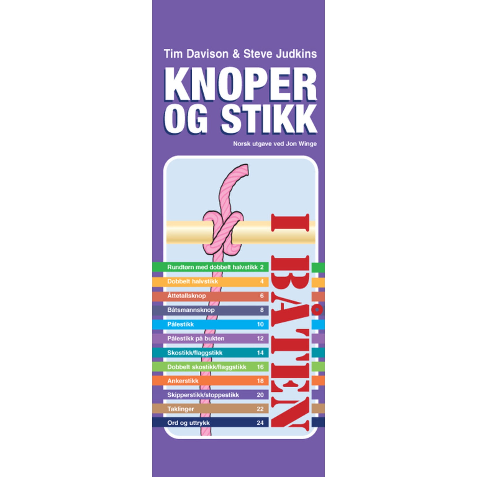 Knoper og stikk i båten er en praktisk og pedagogisk håndbok for båtfolk som vil lære å bruke riktige knuter i riktige situasjoner. Boken er skrevet av Tim Davison og Steve Judkins og gir en tydelig innføring i de mest brukte knopene og stikkene til sjøs, forklart på en enkel og visuelt forståelig måte. Den tar for seg grunnleggende knuter som dobbelt halvstikk, åttetallsknop og pålestikk, samt mer spesialiserte løsninger for fortøyning, ankring, seiling og arbeid på dekk. Hver knop forklares med praktisk anvendelse og tydelige illustrasjoner, slik at den er lett å bruke både som lærebok og oppslagsverk om bord. Den norske utgaven er tilpasset norske forhold av Jon Winge og egner seg for både nybegynnere og mer erfarne båtfolk som ønsker å friske opp kunnskapen.