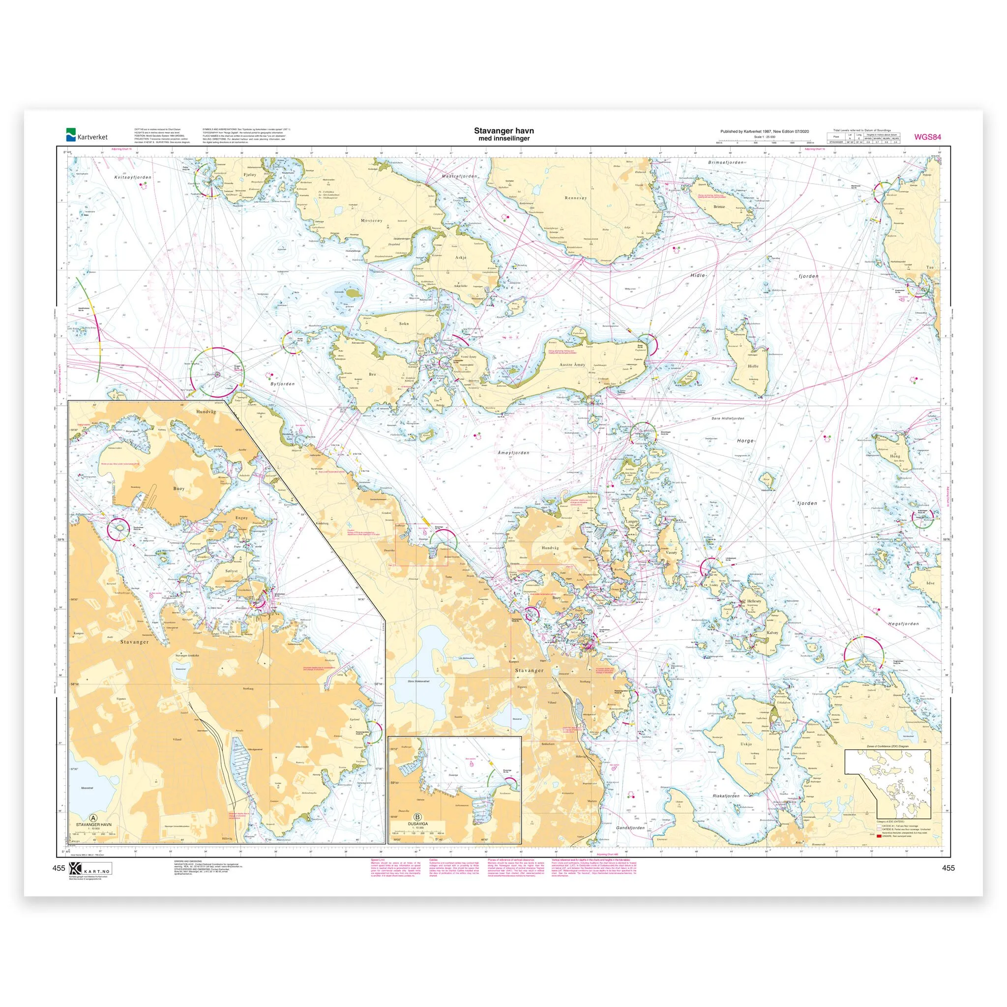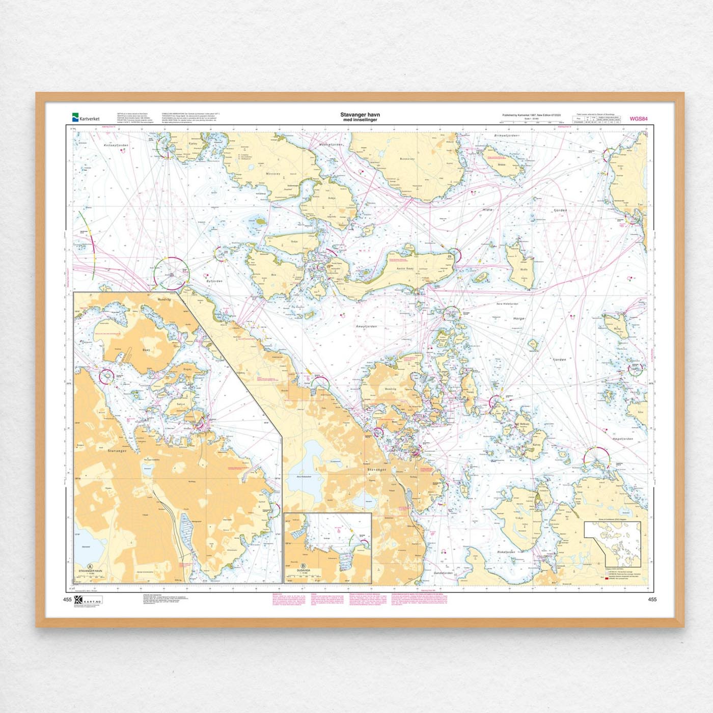 Sjøkart som dekker farvannet Stavanger havn med innseilinger. Kartblad 455 i Kartverkets havnekartserie. Kartet har størrelse 87 x 108 cm og har målestokk 1:25.000. Kan også leveres på plate eller ferdig innrammet. Størrelse med passepartout og ramme er 108 x 128 cm.