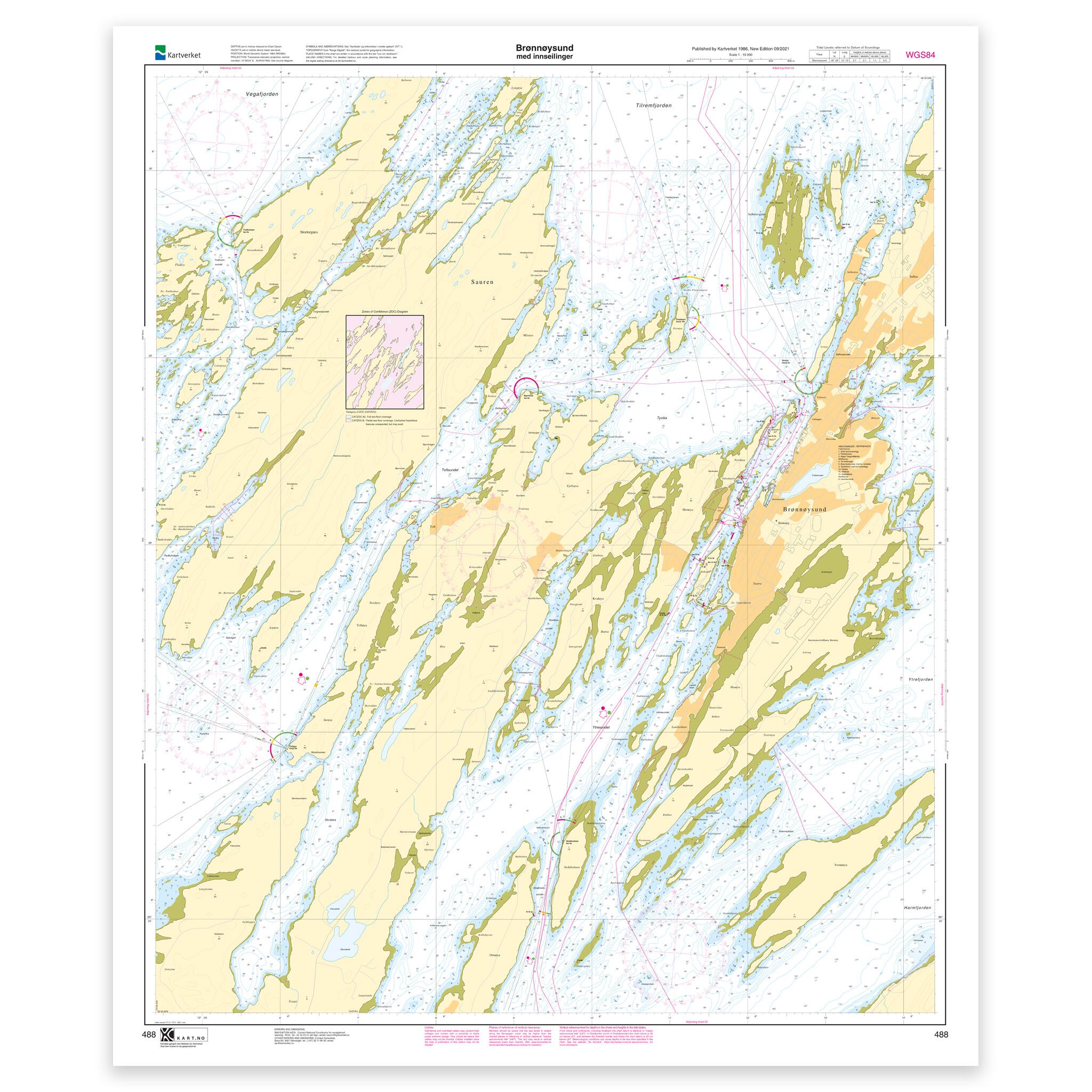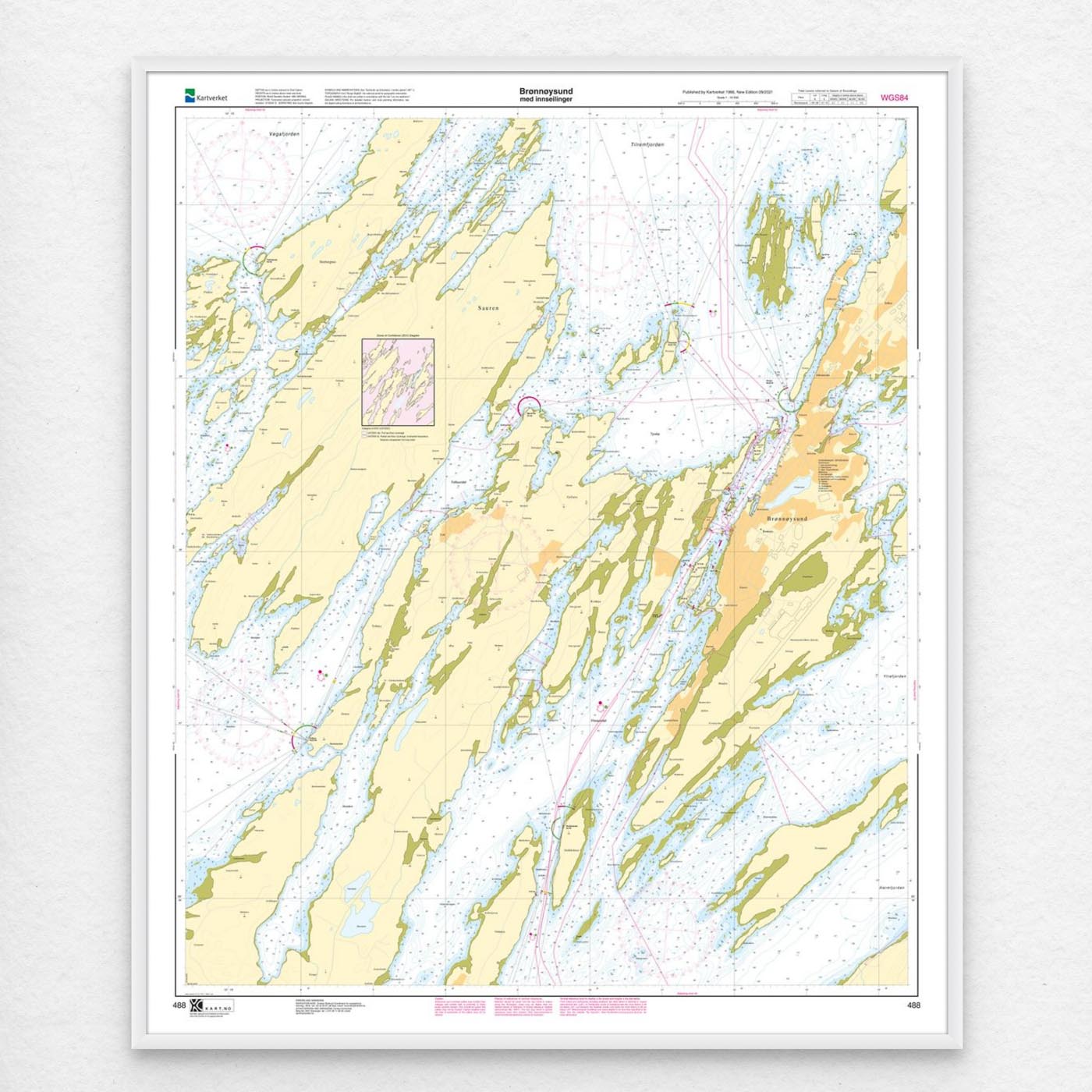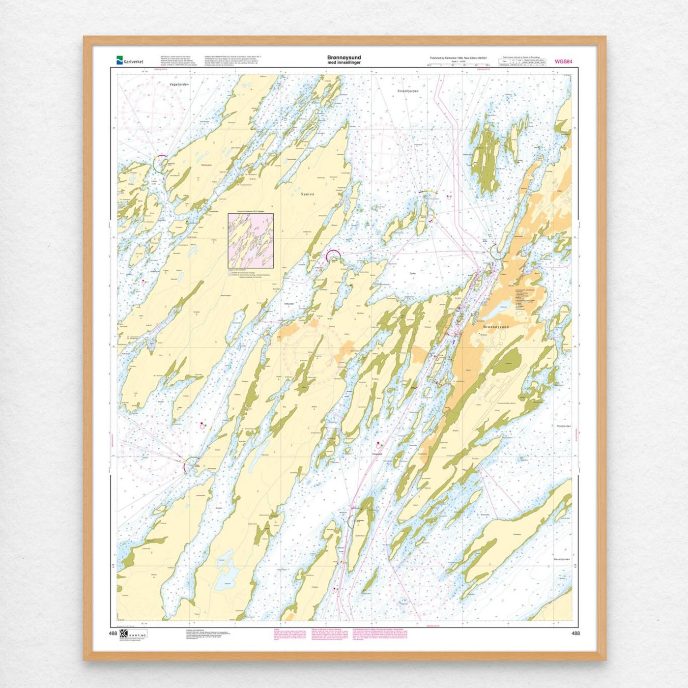 Sjøkart som dekker farvannet Brønnøysund med innseilinger. Kartblad 488 i Kartverkets havnekartserie. Kartet har størrelse 104 x 89 cm og har målestokk 1:10.000. Kan også leveres på plate eller ferdig innrammet. Størrelse med passepartout og ramme er 125 x 109 cm.