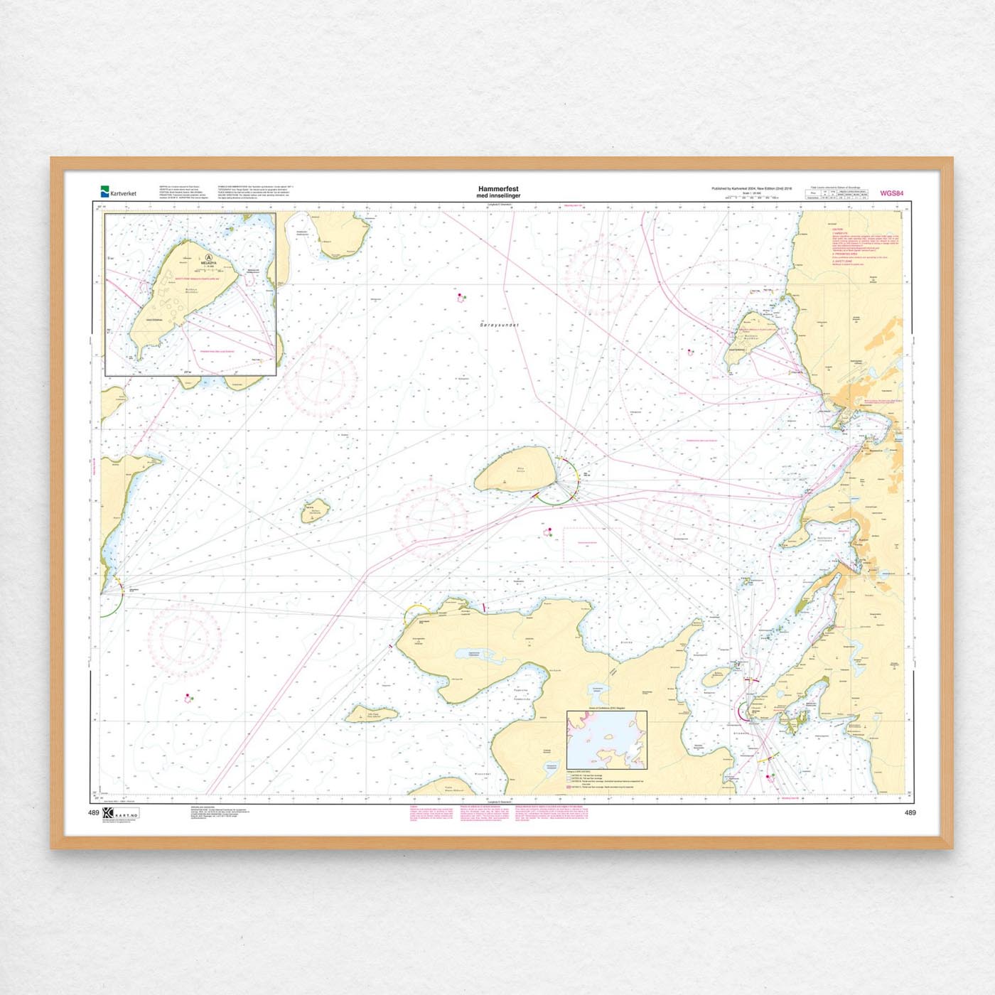 Sjøkart som dekker farvannet Hammerfest med innseilinger. Kartblad 489 i Kartverkets havnekartserie. Kartet har størrelse 86 x 114 cm og har målestokk 1:20.000. Kan også leveres på plate eller ferdig innrammet. Størrelse med passepartout og ramme er 107 x 134 cm.