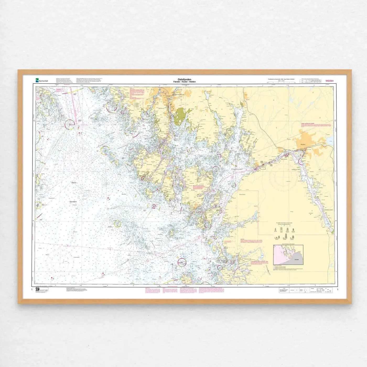 Sjøkart som dekker farvannet Færder – Hvaler – Halden. Kartblad 1 i Kartverkets hovedkartserie (print-on-demand). Kartet har størrelse 82 x 120 cm og har målestokk 1:50.000. Kan også leveres på plate eller ferdig innrammet. Størrelse med passepartout og ramme er 103 x 140 cm.