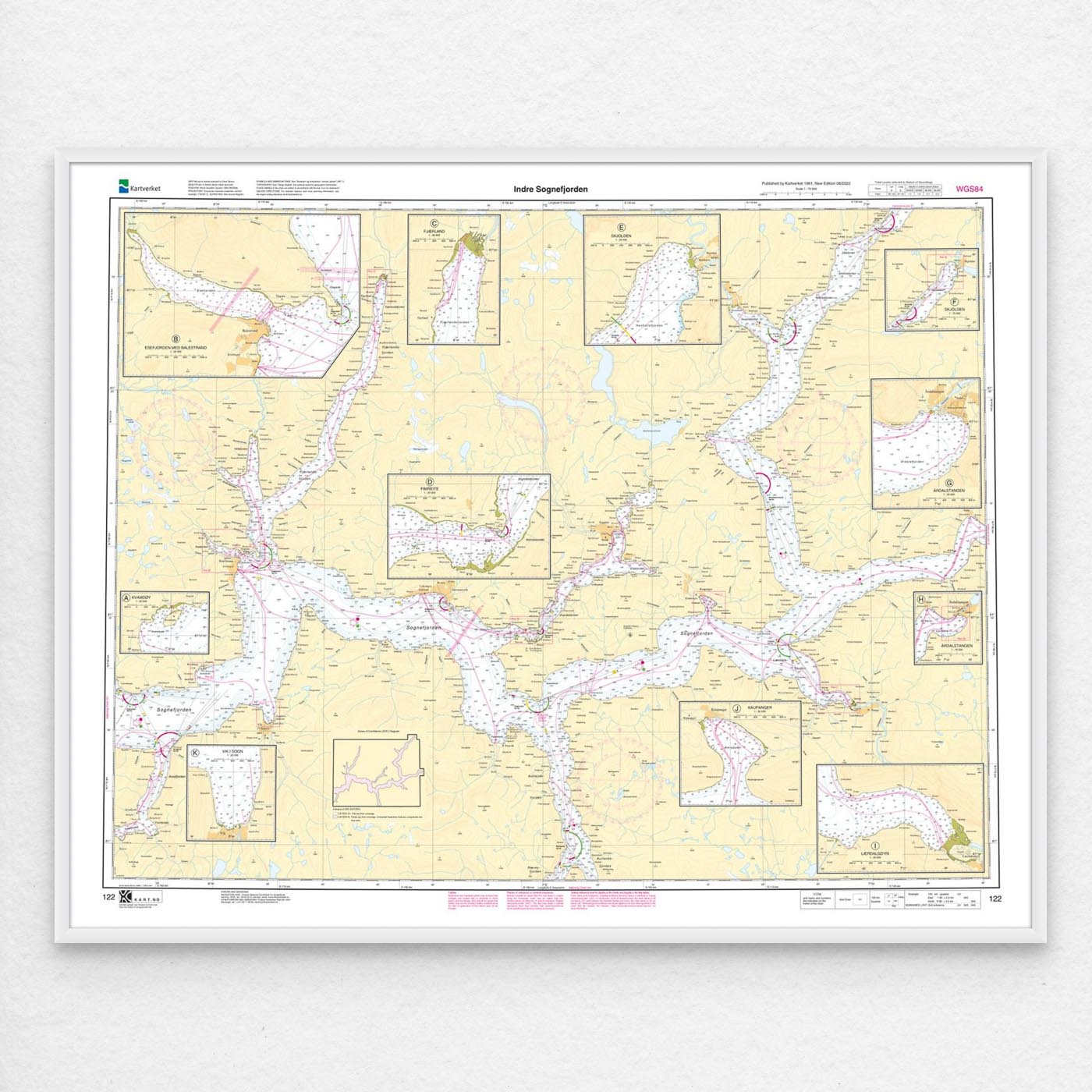 Sjøkart som dekker farvannet Indre Sognefjorden. Kartblad 122 i Kartverkets hovedkartserie. Kartet har størrelse 85 x 107 cm og har målestokk 1:75.000. Kan også leveres på plate eller ferdig innrammet. Størrelse med passepartout og ramme er 106 x 127 cm.