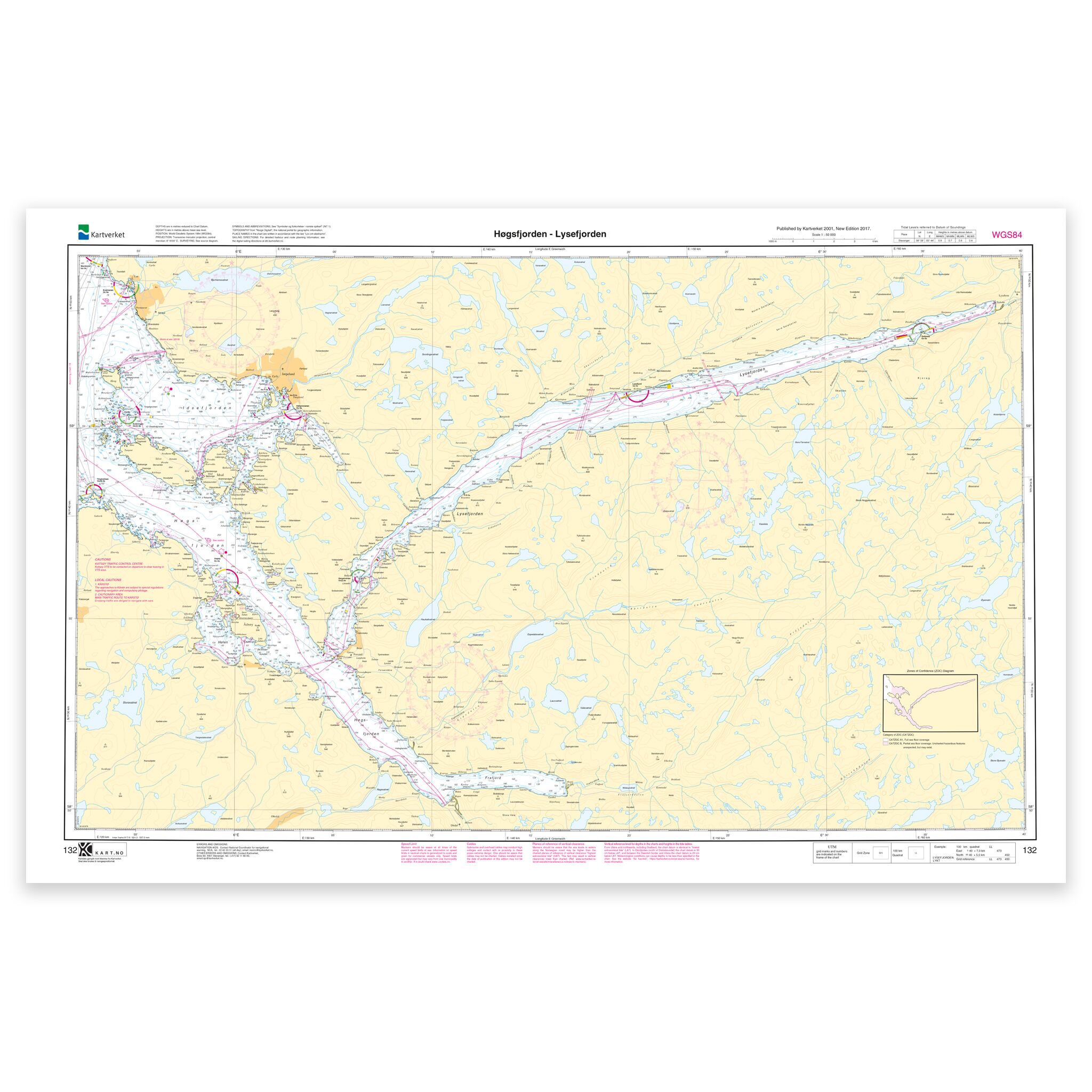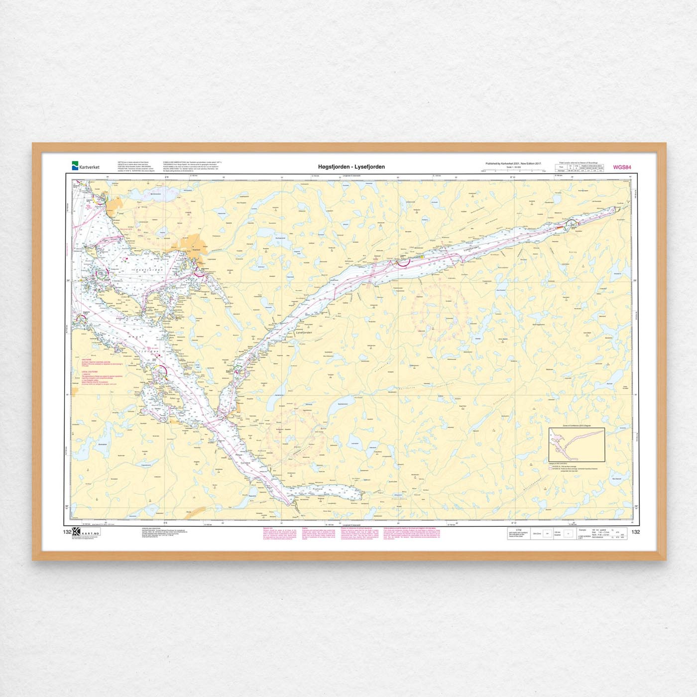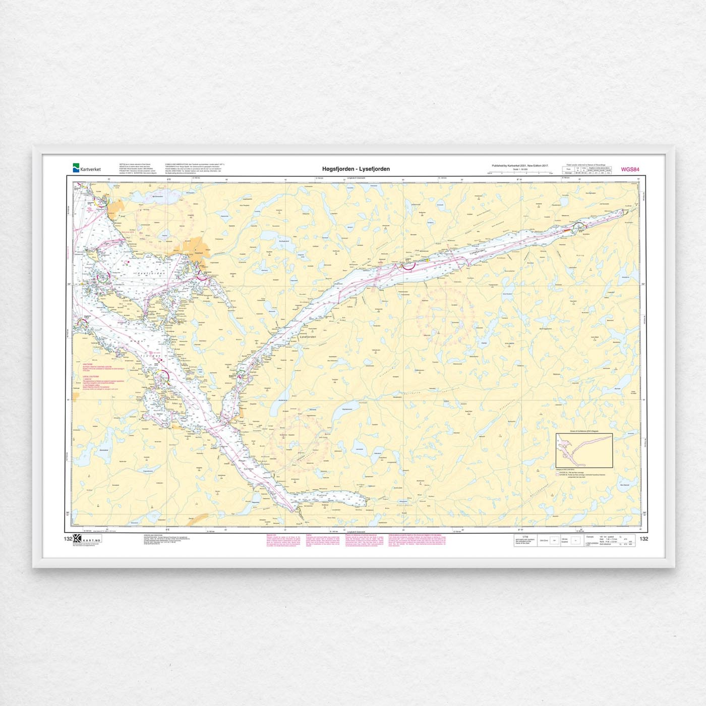 Sjøkart som dekker farvannet Høgsfjorden – Lysefjorden. Kartblad 132 i Kartverkets hovedkartserie. Kartet har størrelse 67 x 104 cm og har målestokk 1:50.000. Kan også leveres på plate eller ferdig innrammet. Størrelse med passepartout og ramme er 88 x 124 cm.