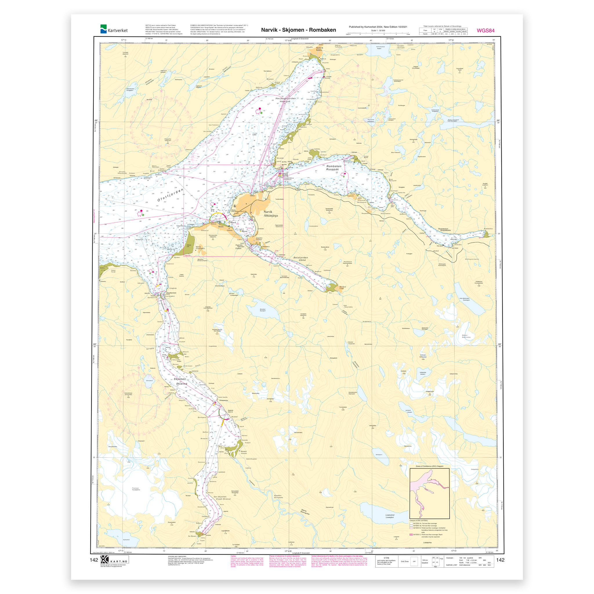 Sjøkart som dekker farvannet Narvik – Skjomen – Rombaken. Kartblad 142 i Kartverkets hovedkartserie. Kartet har størrelse 95 x 78 cm og har målestokk 1:50.000. Kan også leveres på plate eller ferdig innrammet. Størrelse med passepartout og ramme er 116 x 98 cm.