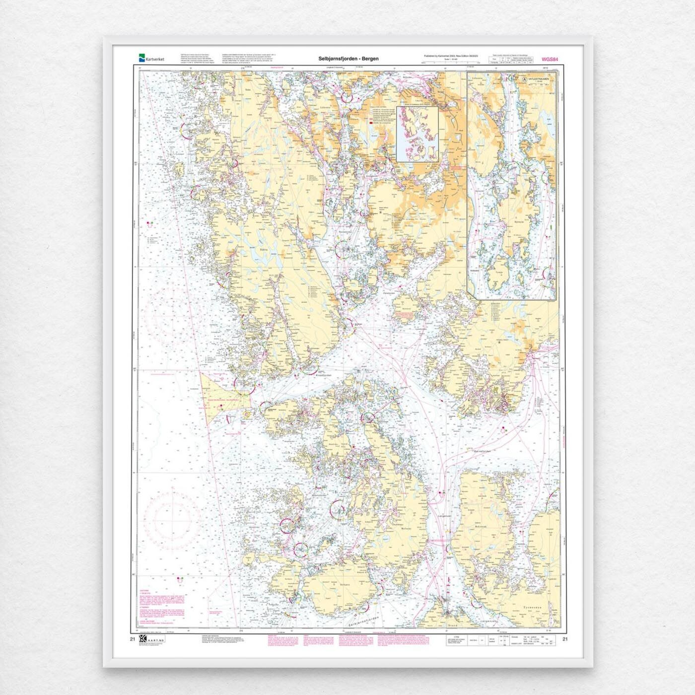 Sjøkart som dekker farvannet Selbjørnsfjorden – Bergen. Kartblad 21 i Kartverkets hovedkartserie. Kartet har størrelse 112 x 88 cm og har målestokk 1:50.000. Kan også leveres på plate eller ferdig innrammet. Størrelse med passepartout og ramme er 133 x 108 cm.