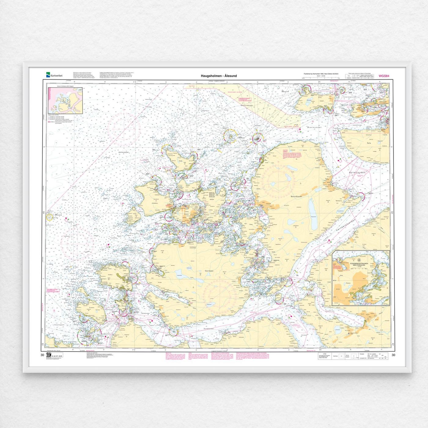Sjøkart som dekker farvannet Haugsholmen – Ålesund. Kartblad 30 i Kartverkets hovedkartserie. Kartet har størrelse 86 x 109 cm og har målestokk 1:50.000. Kan også leveres på plate eller ferdig innrammet. Størrelse med passepartout og ramme er 107 x 129 cm.