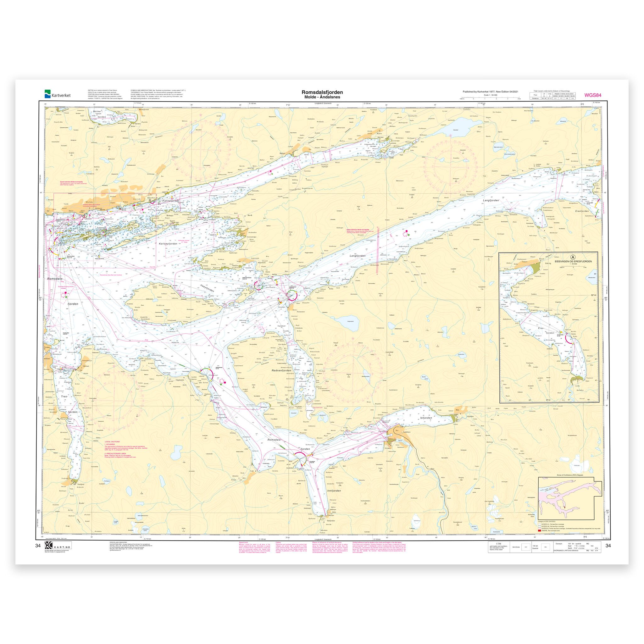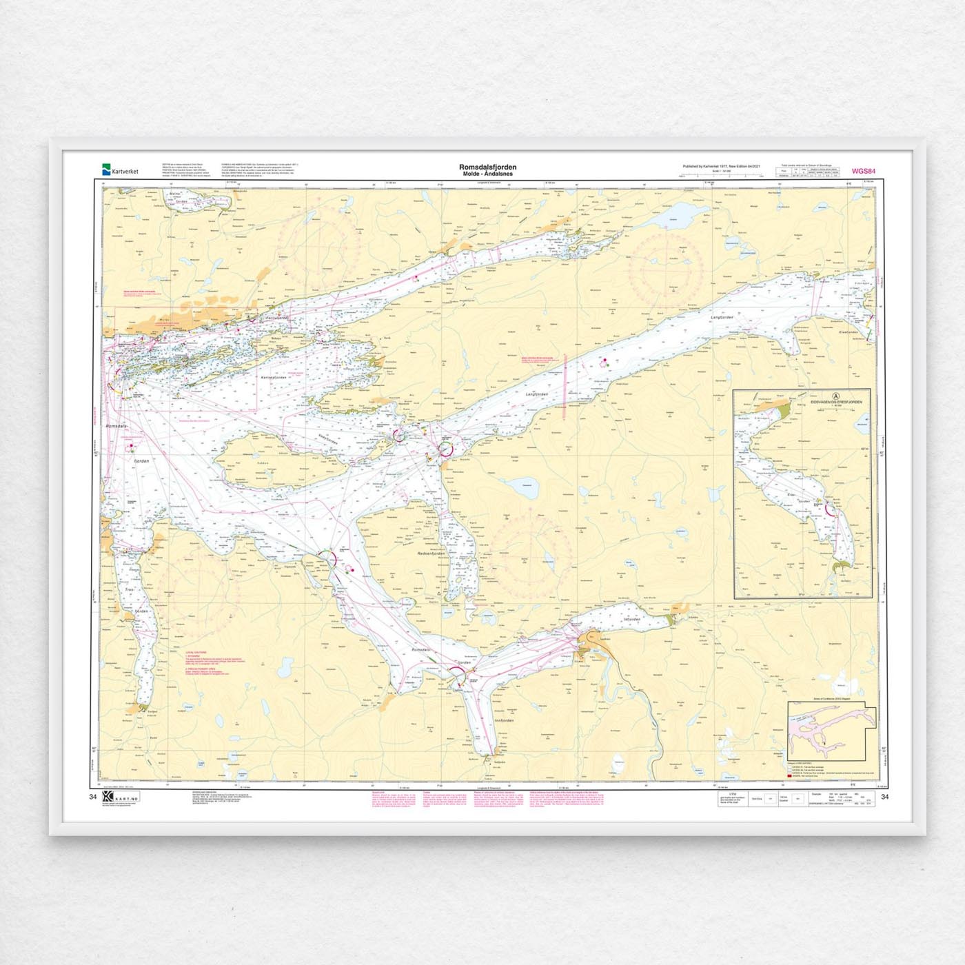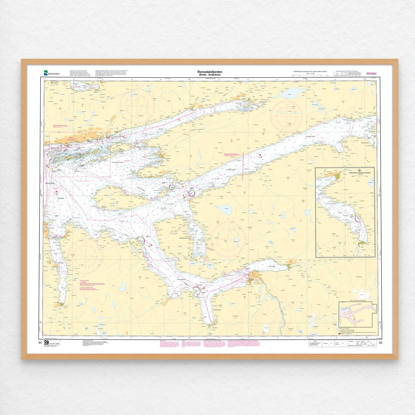 Sjøkart som dekker farvannet Romsdalsfjorden. Molde – Åndalsnes. Kartblad 34 i Kartverkets hovedkartserie. Kartet har størrelse 86 x 109 cm og har målestokk 1:50.000. Kan også leveres på plate eller ferdig innrammet. Størrelse med passepartout og ramme er 107 x 129 cm.
