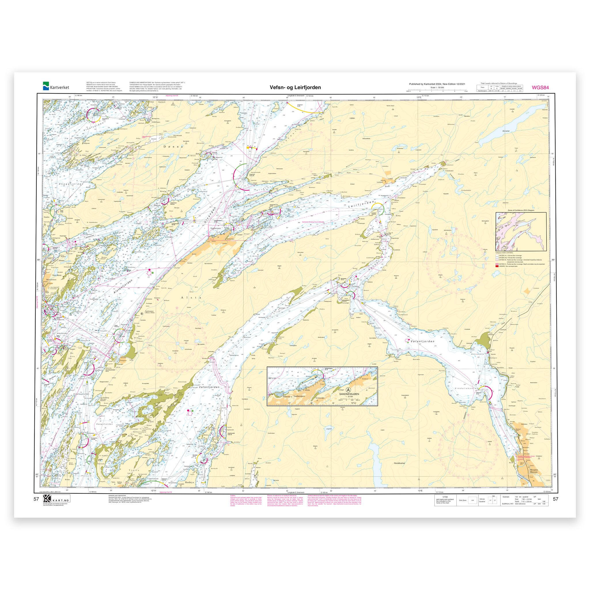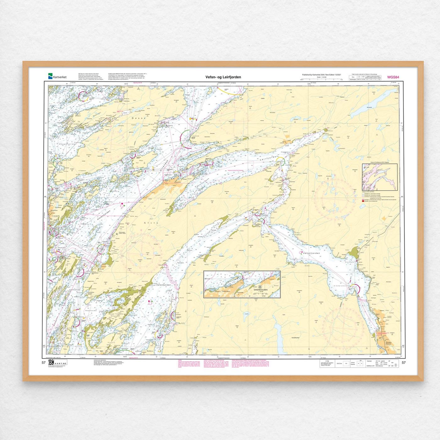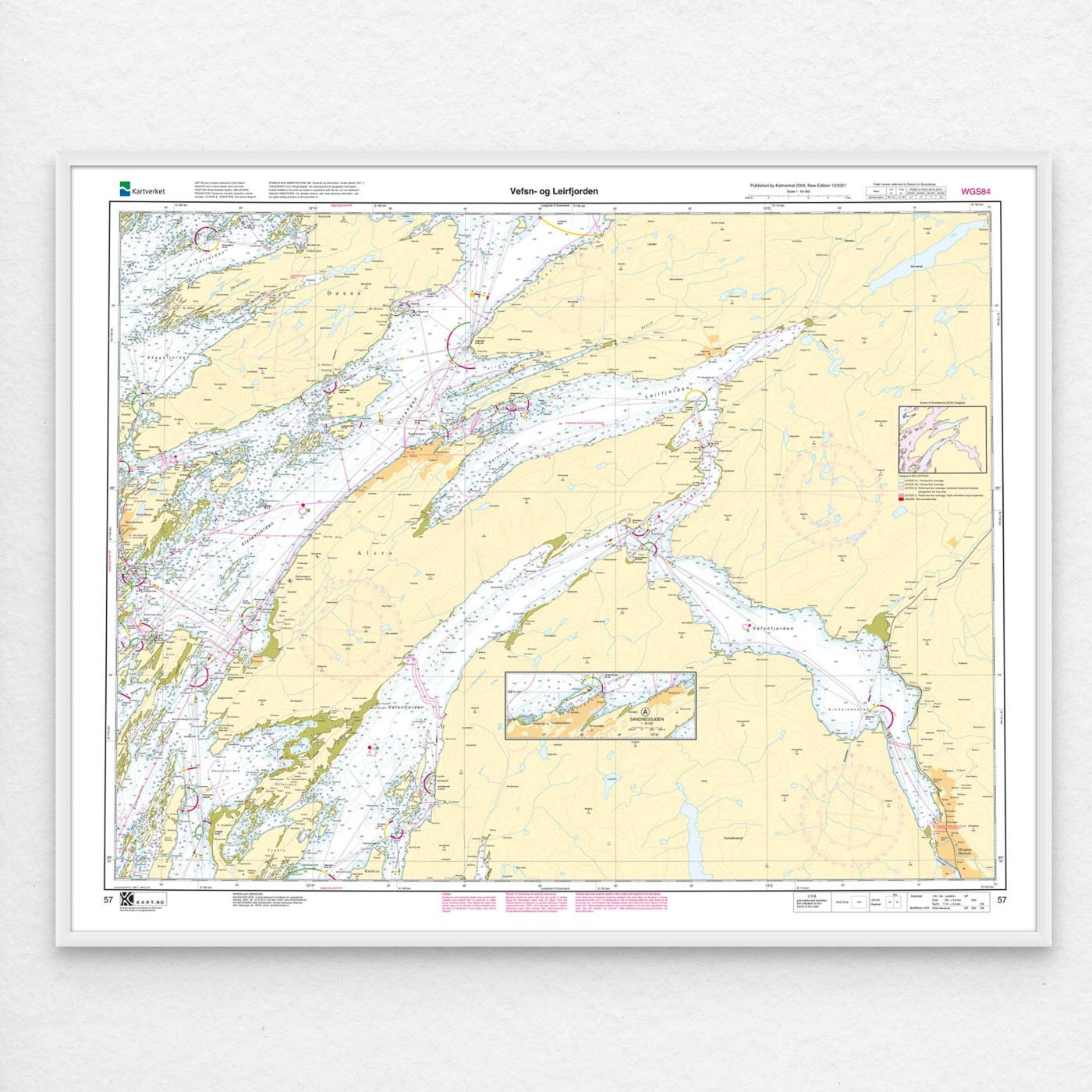 Sjøkart som dekker farvannet Vefsn- og Leirfjorden. Kartblad 57 i Kartverkets hovedkartserie. Kartet har størrelse 78 x 100 cm og har målestokk 1:50.000. Kan også leveres på plate eller ferdig innrammet. Størrelse med passepartout og ramme er 99 x 120 cm.