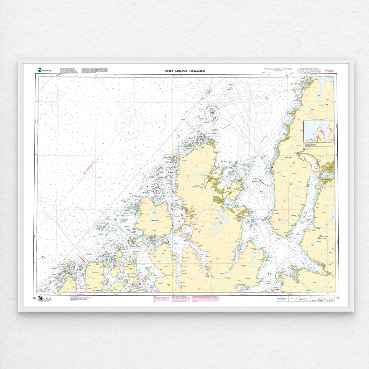 Sjøkart som dekker farvannet Hovden – Langenes – Risøysundet. Kartblad 78 i Kartverkets hovedkartserie. Kartet har størrelse 86 x 115 cm og har målestokk 1:50.000. Kan også leveres på plate eller ferdig innrammet. Størrelse med passepartout og ramme er 107 x 135 cm.