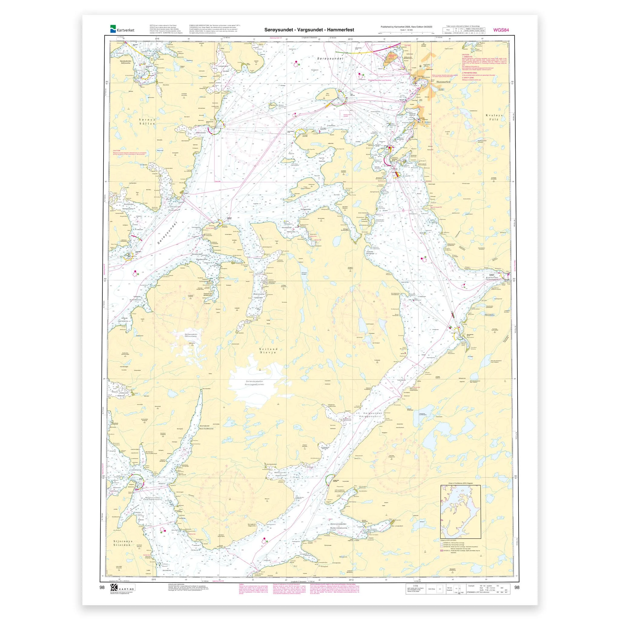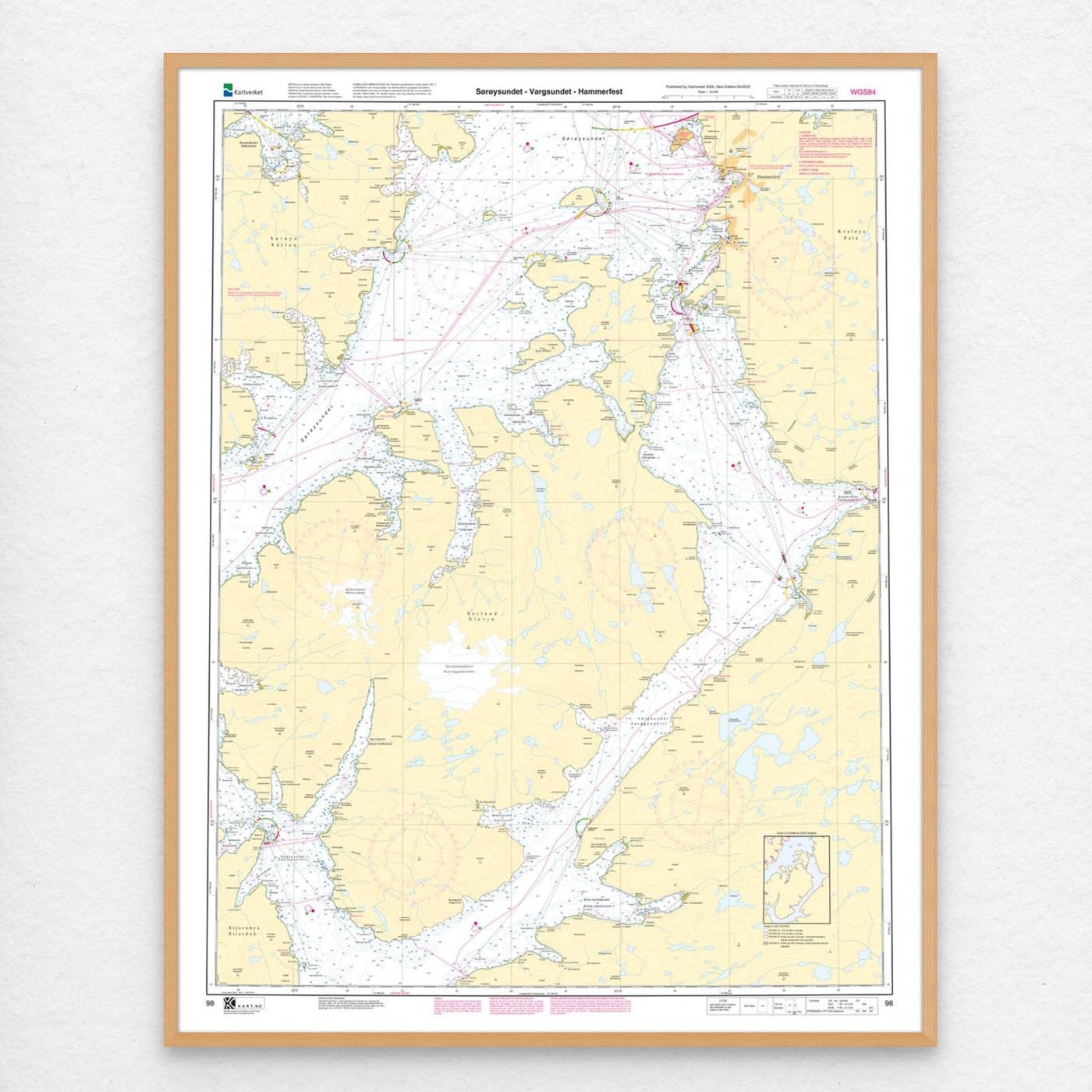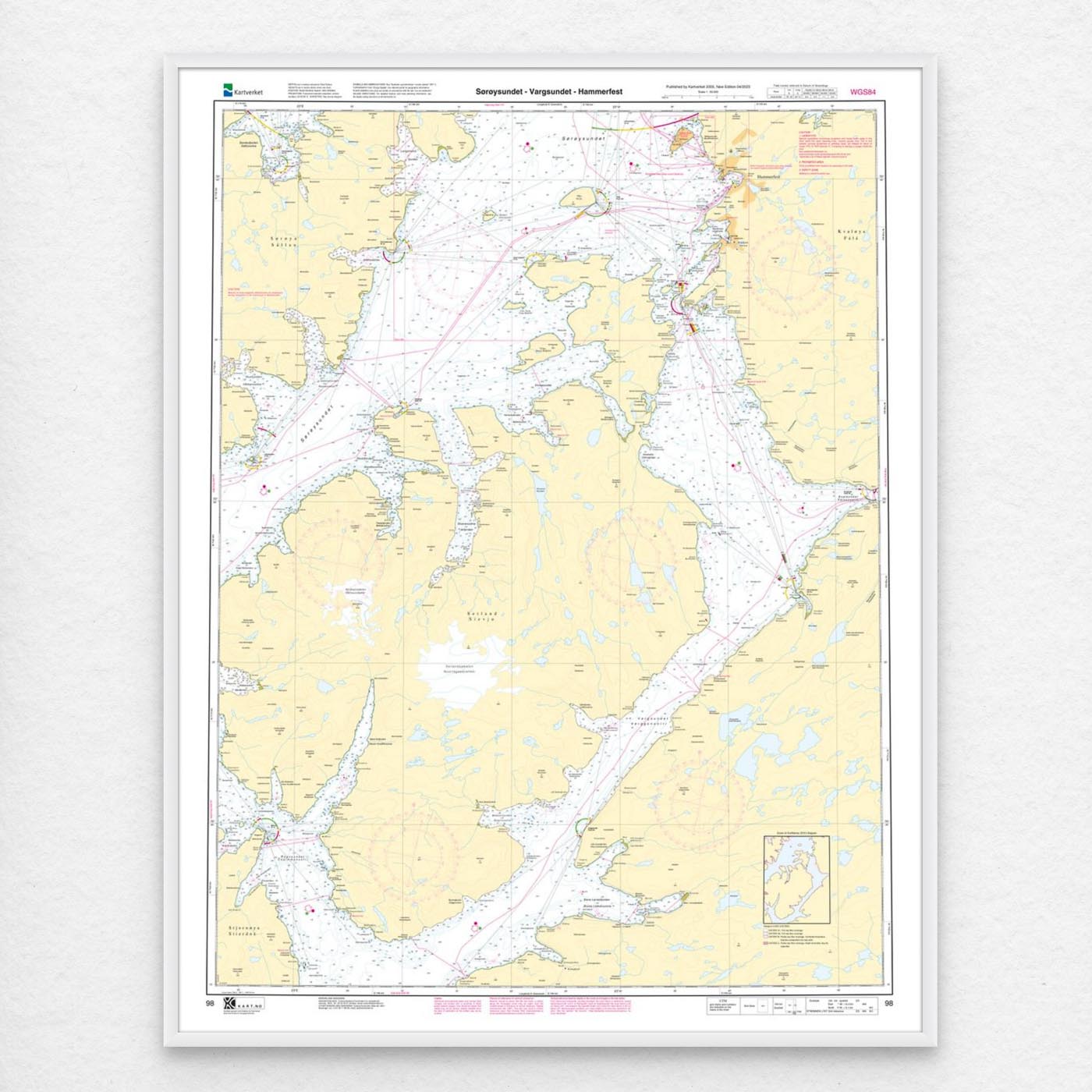 Sjøkart som dekker farvannet Sørøysundet – Vargsundet – Hammerfest. Kartblad 98 i Kartverkets hovedkartserie. Kartet har størrelse 112 x 88 cm og har målestokk 1:50.000. Kan også leveres på plate eller ferdig innrammet. Størrelse med passepartout og ramme er 133 x 108 cm.