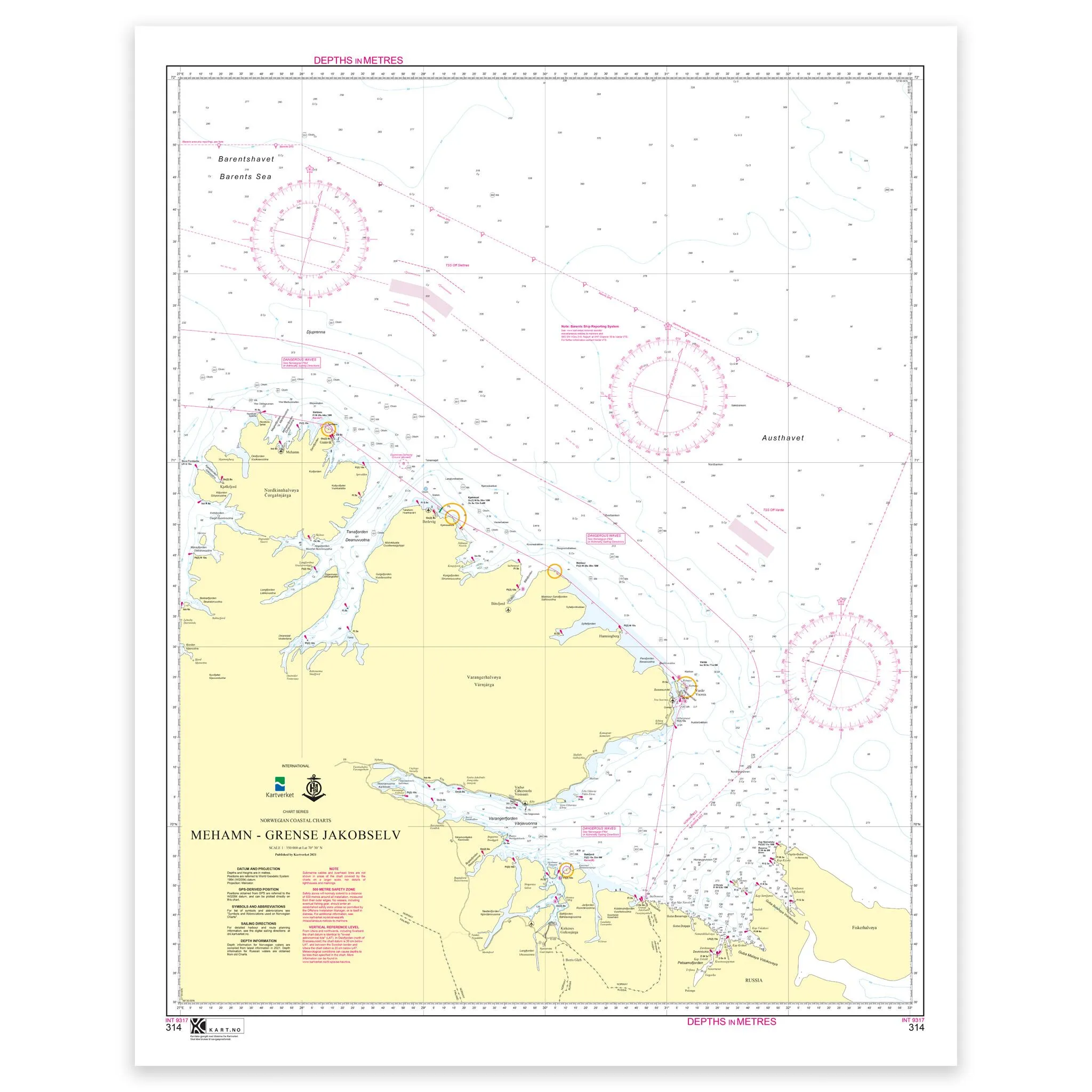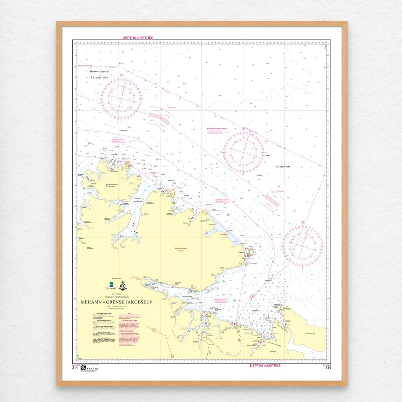 Kartverkets kystkart er oversiktskart med målestokk 1:350.000. Kartene leveres på rull i størrelse 119×84 cm cm. Kan også leveres på plate eller ferdig innrammet. Størrelse med passepartout og ramme er 129 x 104 cm.
