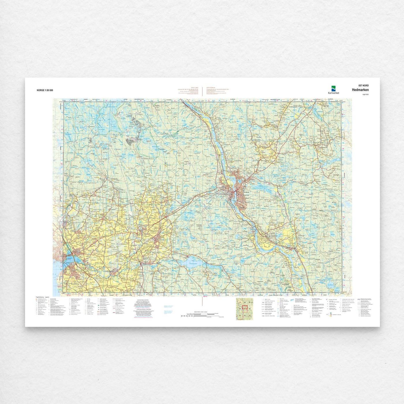 Norge 1:50000 (N50) er Kartverkets topografiske hovedkartserie. Inneholder bebyggelse, høydekurver, skog, dyrka mark, kystkontur, elver, bekker, vann, myr, breer, veier, stier, jernbaner, flyplasser, kommunegrenser, verneområder, samt detaljert dybde- og navigasjonsinformasjon hentet fra sjøkartene. Kartet har har målestokk 1:50.000 og leveres på rull i størrelse 104 x 73 cm. Kan også leveres på plate eller ferdig innrammet. Størrelse med passepartout og ramme er 124 x 93 cm.