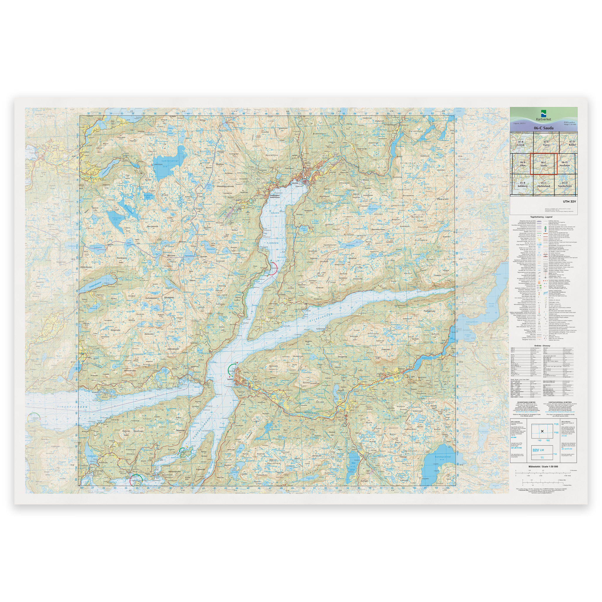 Kartverkets klassiske landkartserie (N50)- i ny oppdatert utgave, utgitt i mai 2025. Viser bebyggelse, høydekurver, skog, dyrka mark, kystkontur, elver, bekker, vann, myr, breer, veier, stier, jernbaner, flyplasser, kommunegrenser, verneområder, samt detaljert dybde- og navigasjonsinformasjon hentet fra sjøkartene. Kartet har har målestokk 1:50.000 og leveres på rull i størrelse 103 x 73 cm. Kan også leveres på plate eller ferdig innrammet. Størrelse med passepartout og ramme er 124 x 93 cm.