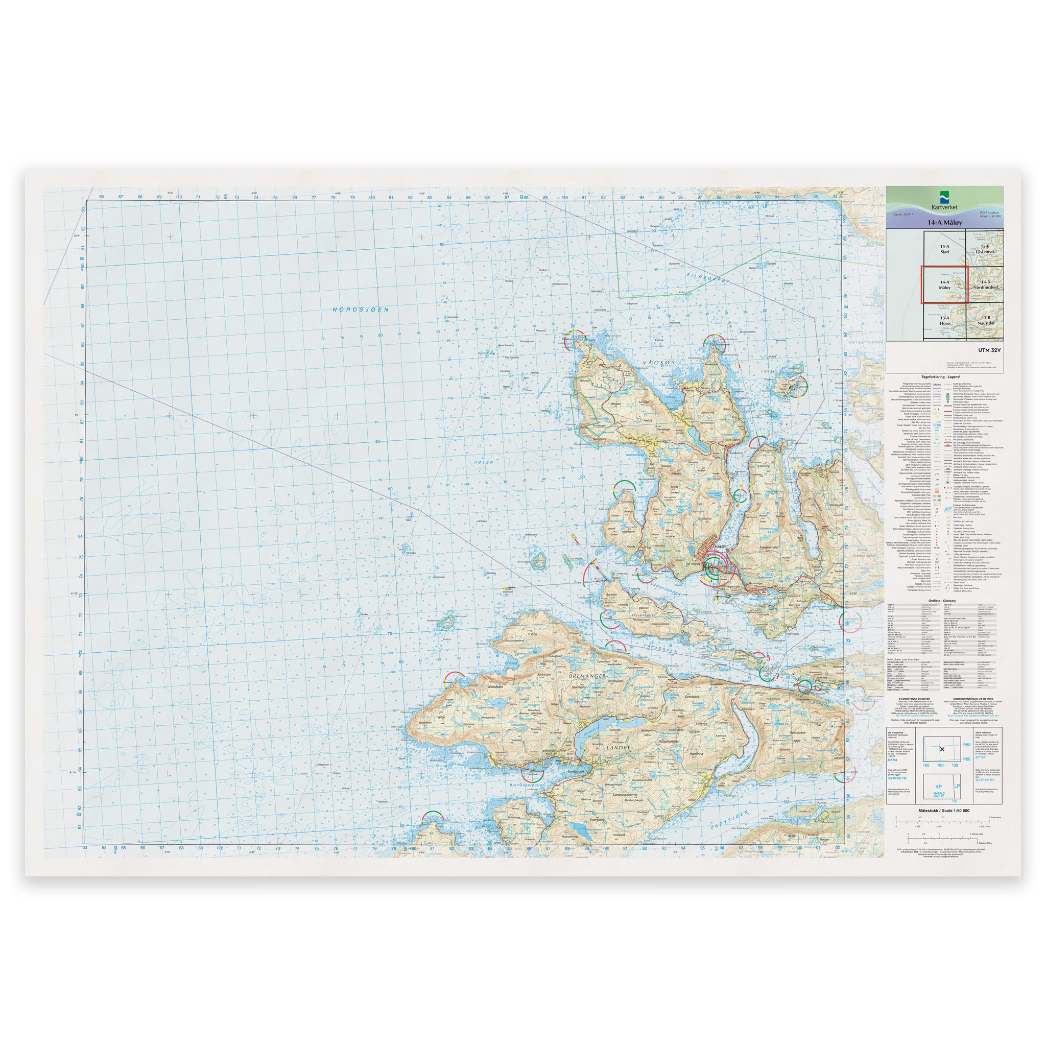 Kartverkets klassiske landkartserie (N50)- i ny oppdatert utgave, utgitt i mai 2025. Viser bebyggelse, høydekurver, skog, dyrka mark, kystkontur, elver, bekker, vann, myr, breer, veier, stier, jernbaner, flyplasser, kommunegrenser, verneområder, samt detaljert dybde- og navigasjonsinformasjon hentet fra sjøkartene. Kartet har har målestokk 1:50.000 og leveres på rull i størrelse 103 x 73 cm. Kan også leveres på plate eller ferdig innrammet. Størrelse med passepartout og ramme er 124 x 93 cm.