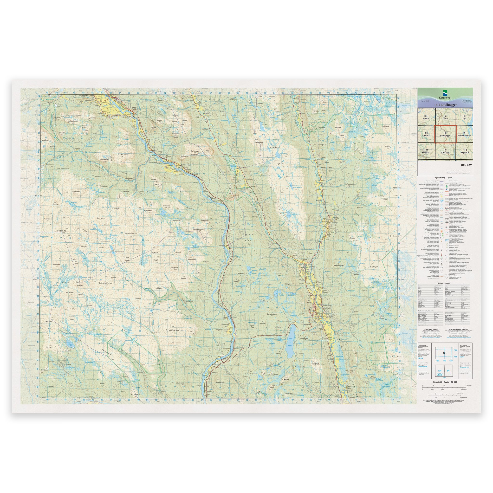 Kartverkets klassiske landkartserie (N50)- i ny oppdatert utgave, utgitt i mai 2025. Viser bebyggelse, høydekurver, skog, dyrka mark, kystkontur, elver, bekker, vann, myr, breer, veier, stier, jernbaner, flyplasser, kommunegrenser, verneområder, samt detaljert dybde- og navigasjonsinformasjon hentet fra sjøkartene. Kartet har har målestokk 1:50.000 og leveres på rull i størrelse 103 x 73 cm. Kan også leveres på plate eller ferdig innrammet. Størrelse med passepartout og ramme er 124 x 93 cm.