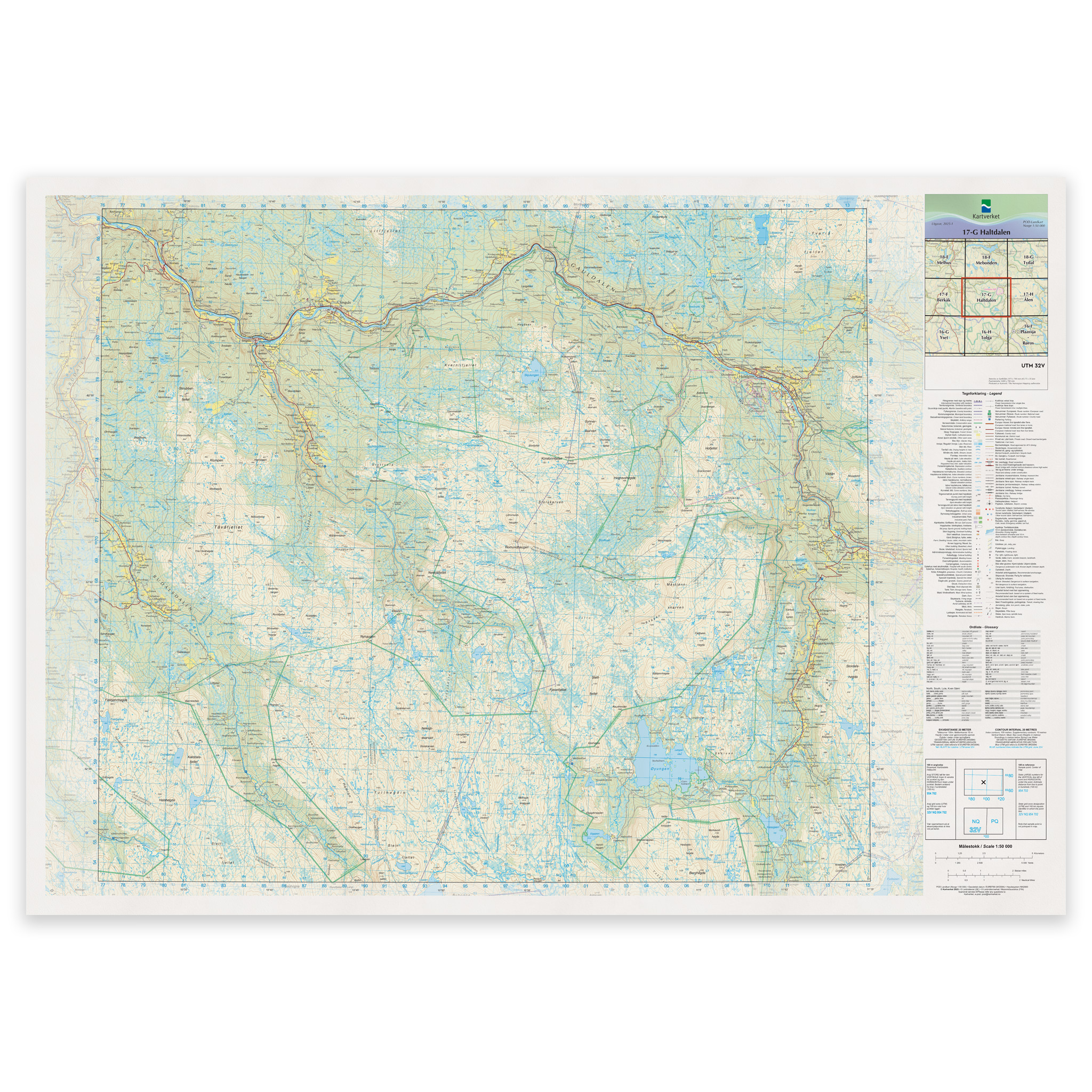 Målestokken 1:50 000 gir en optimal balanse mellom detaljer og oversikt, og gjør kartet velegnet både til aktiv bruk i felt og til analyse, undervisning og veggmontering hjemme, på hytta eller på kontoret.